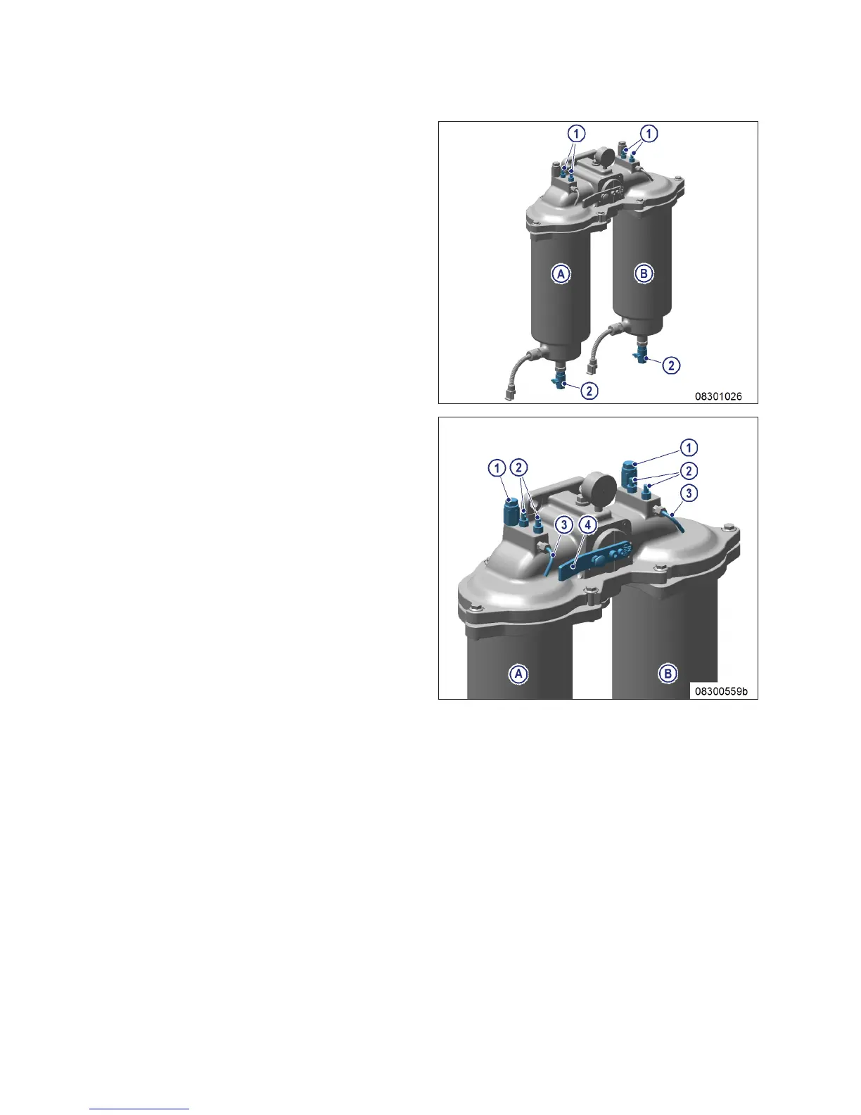2. Open threaded vent plug (1) of the filter to