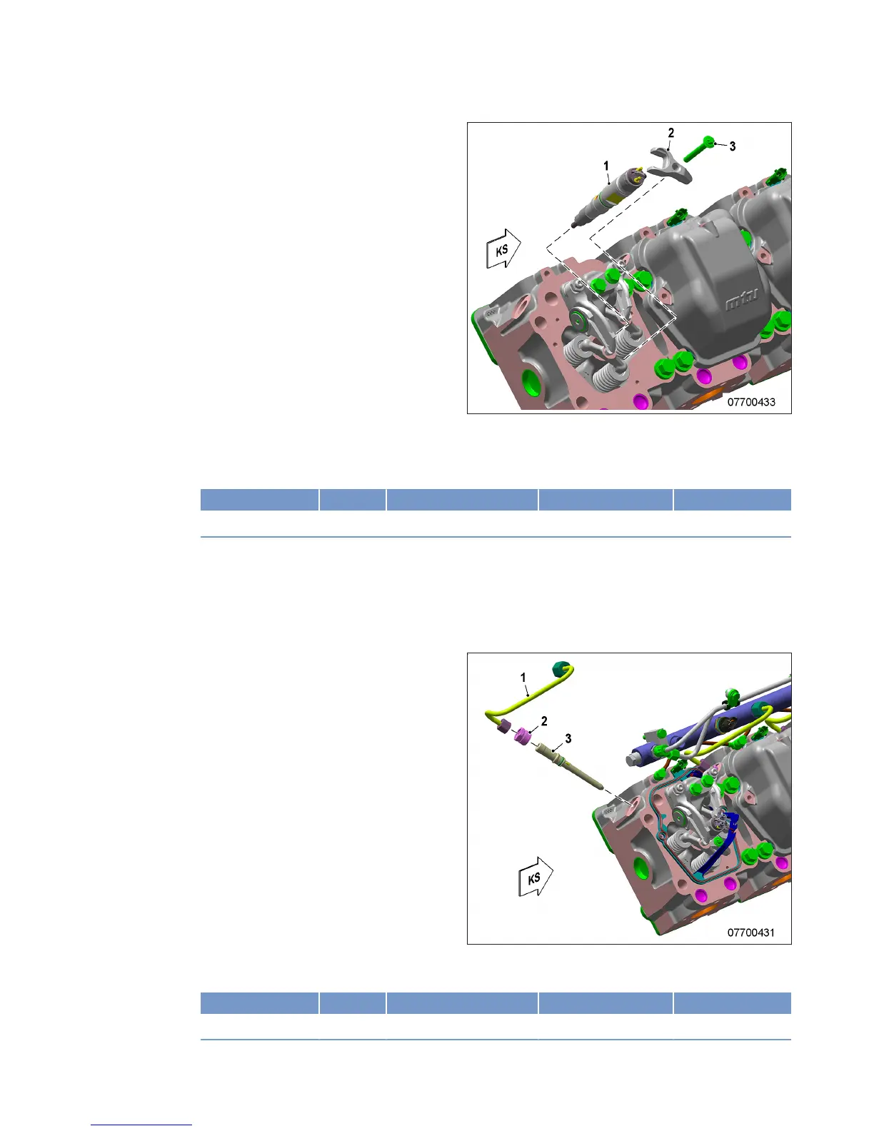 1. Screw in new screw (3) and press injector (1) carefully into the cylinder head by tightening screw (3).