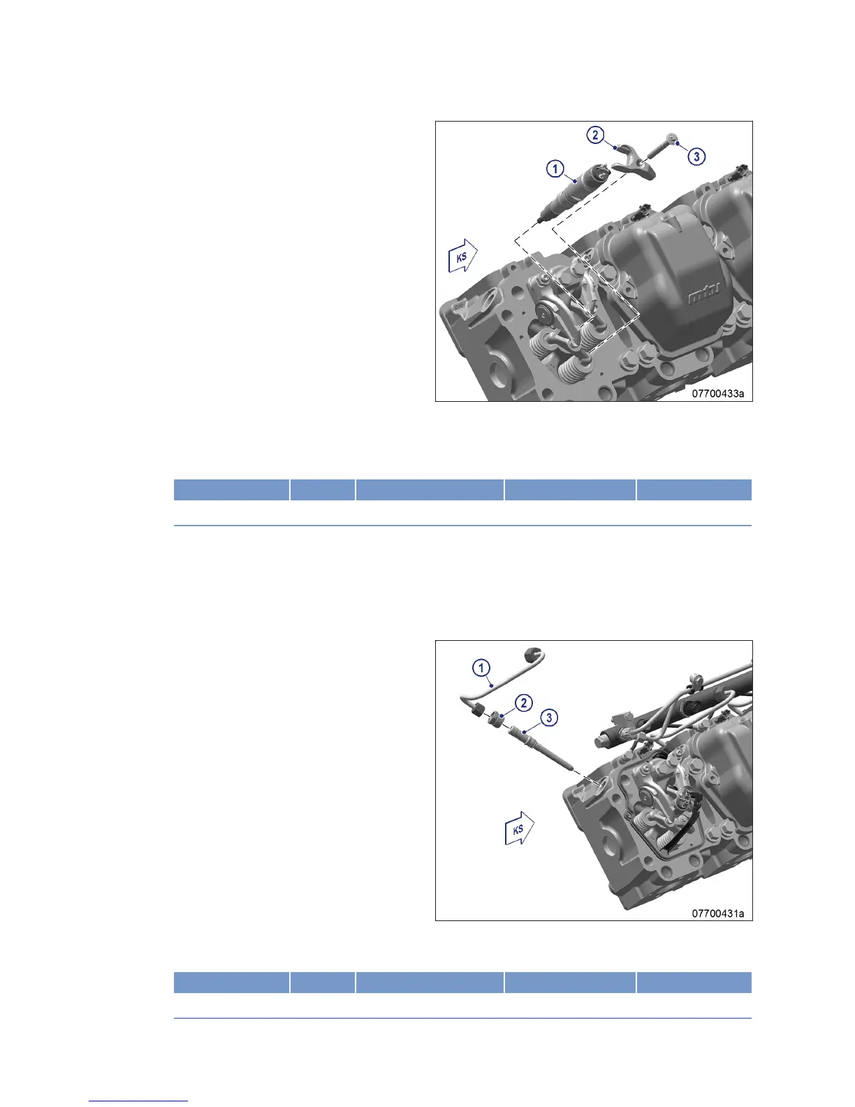 1. Place installation device onto hold-down clamp and carefully press injector (1) into cylinder head.