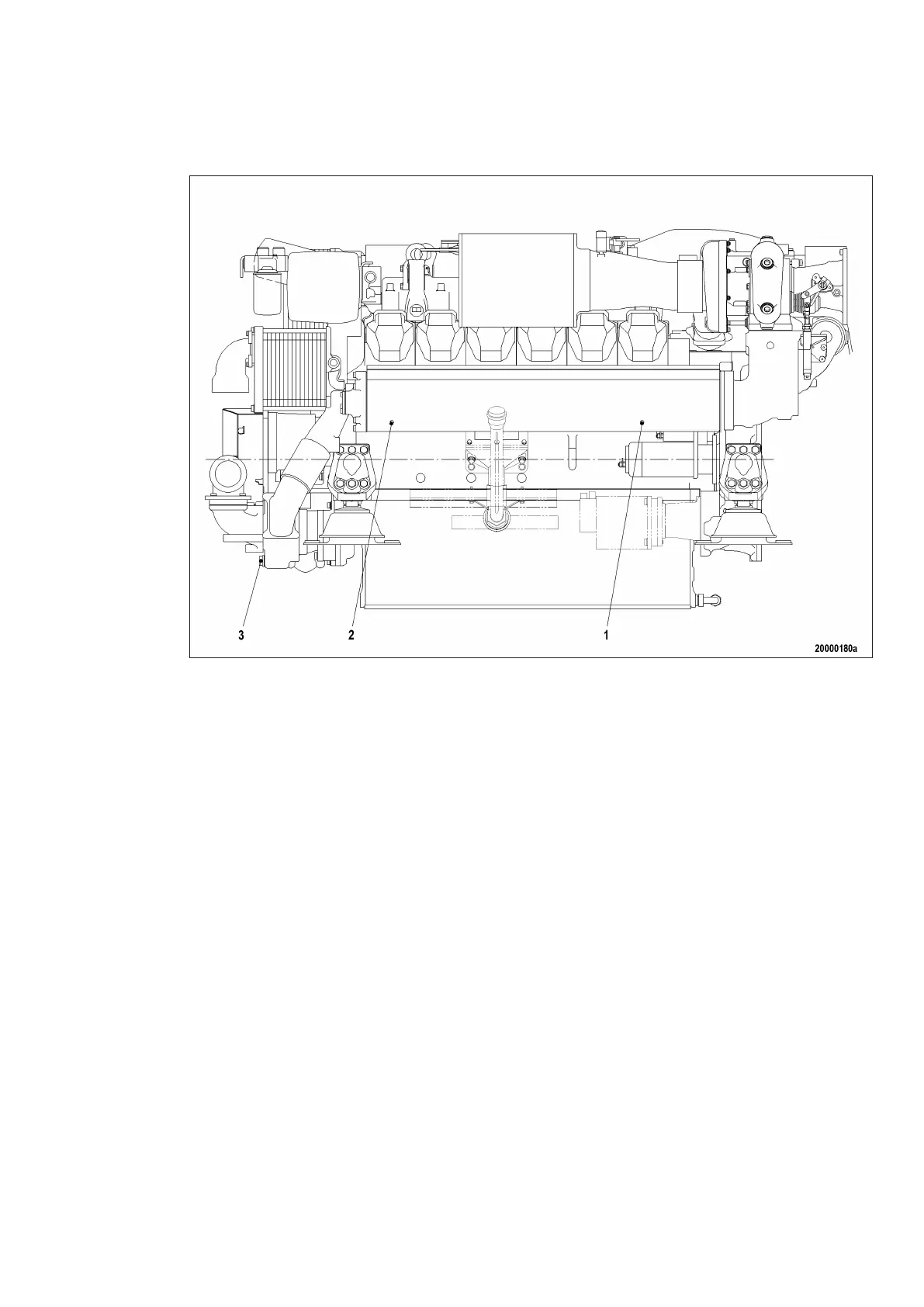 1 Engine coolant drain plug 2 Engine coolant drain plug 3 Raw water pump drain plug