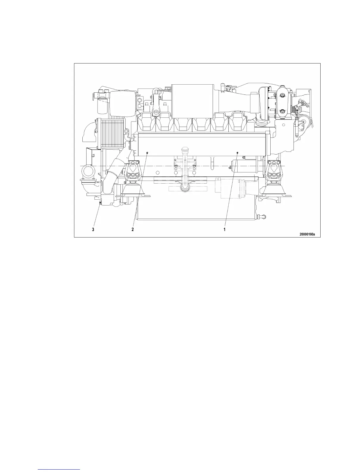 1 Engine coolant drain plug 2 Engine coolant drain plug 3 Raw water pump drain
