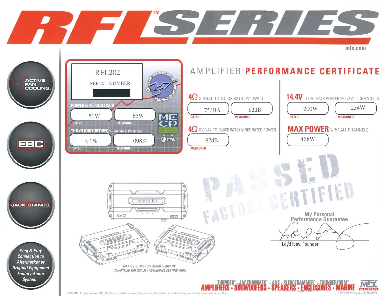 MTX RFL Series - Amplifier Performance Certificate; Power @ 4Ω Watts;Ch; 14.4 V Total RMS Power @ 2Ω All Channels