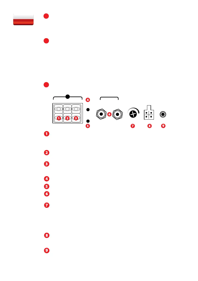 Złącze RCA - podłącz jednostke sterująca do wzmacniacza za pomocą kabli sygnałowych RCA. Minimalna wartość sygnału wyjściowego