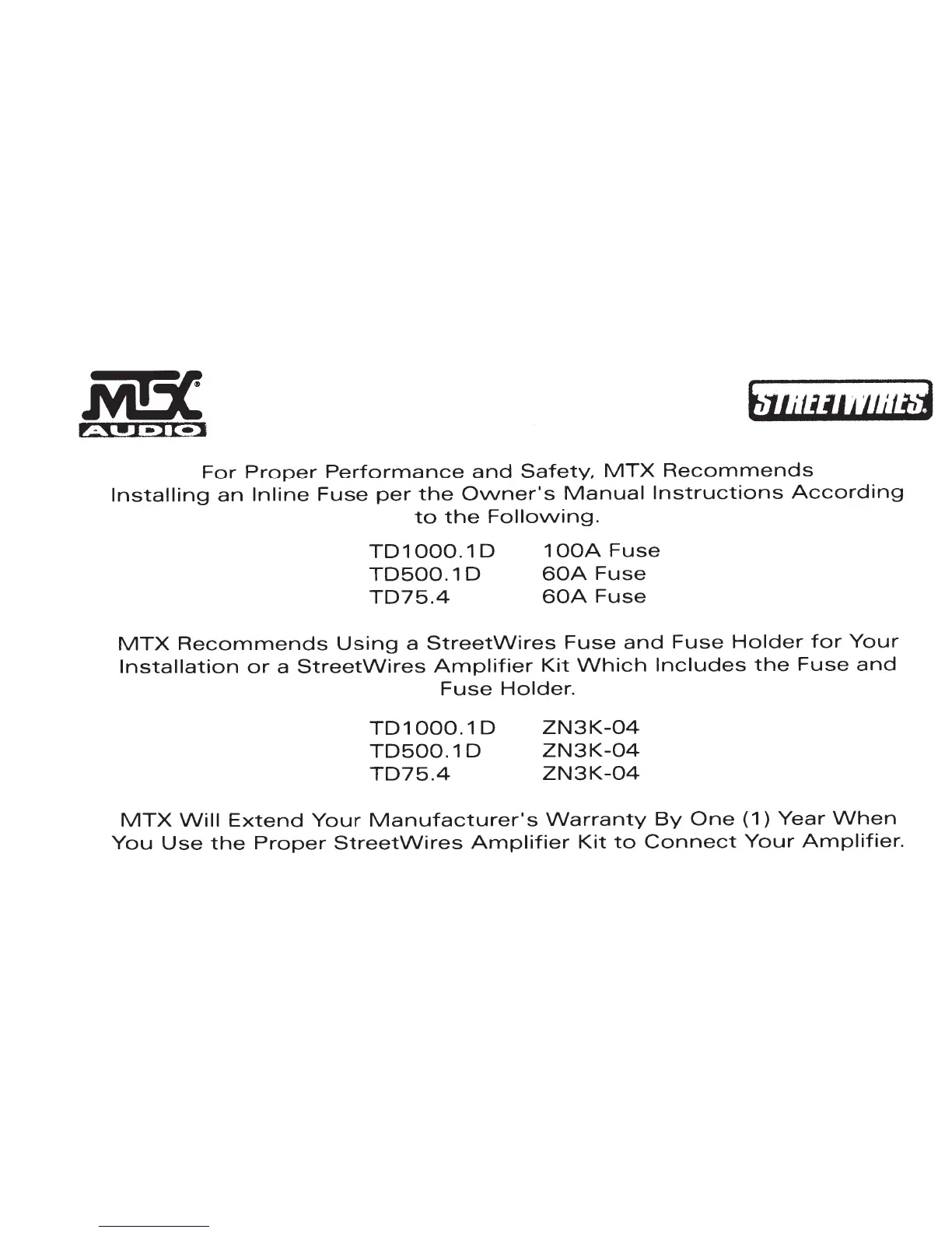 MTX TD1000.1D - Recommended Accessories and Warranty