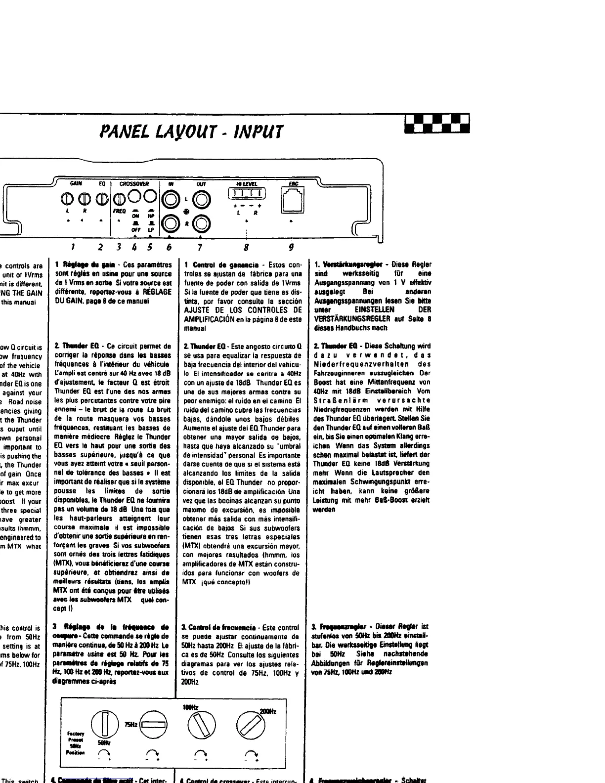 MTX thunder 2300x - Input Panel Layout; Gain Control Adjustment; Thunder EQ Bass Enhancement; Crossover Frequency Adjustment