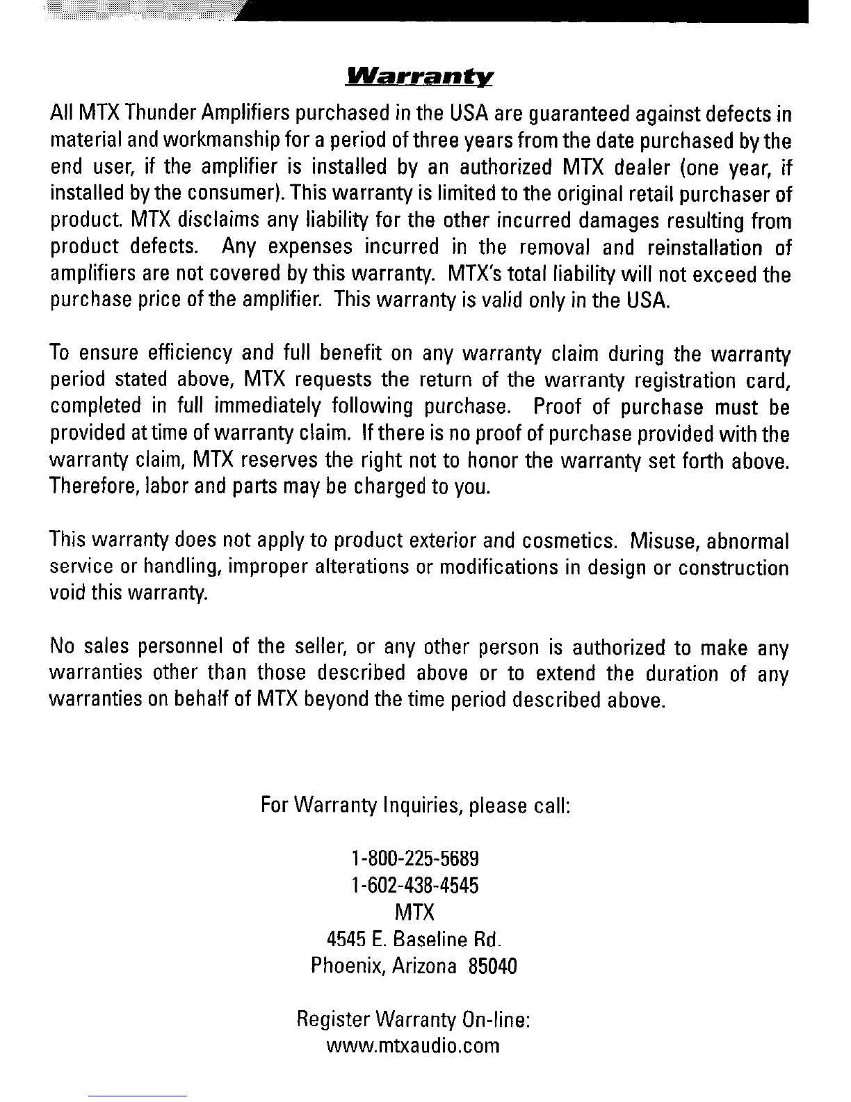 end user, if the amplifier is installed by an authorized MTX dealer (one year, if