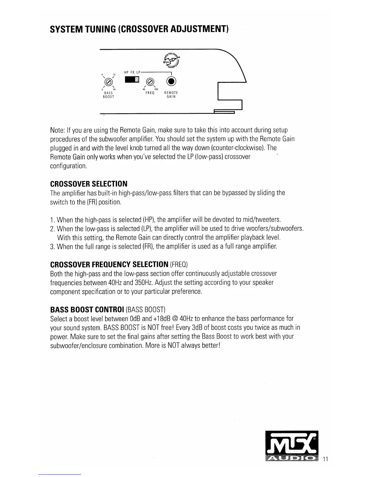 MTX Thunder TC4002 - System Tuning (Crossover Adjustment); Crossover Selection; Crossover Frequency Selection (Freq); Bass Boost Control (Bass Boost)