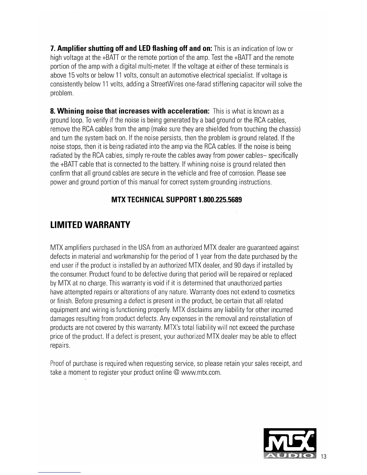 MTX Thunder TC4002 - Amplifier shutting off and LED flashing off and on; Whining noise that increases with acceleration; Limited Warranty