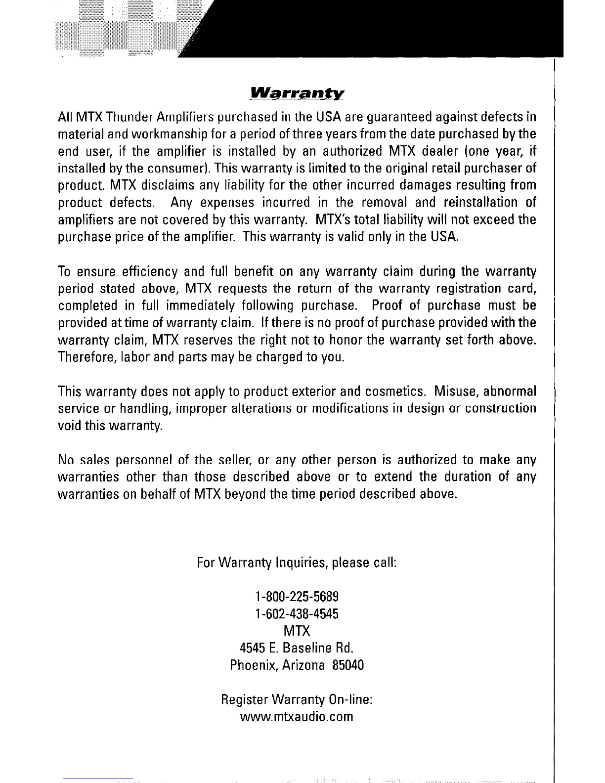 All MTX Thunder Amplifiers purchased in the USA are guaranteed against defects in