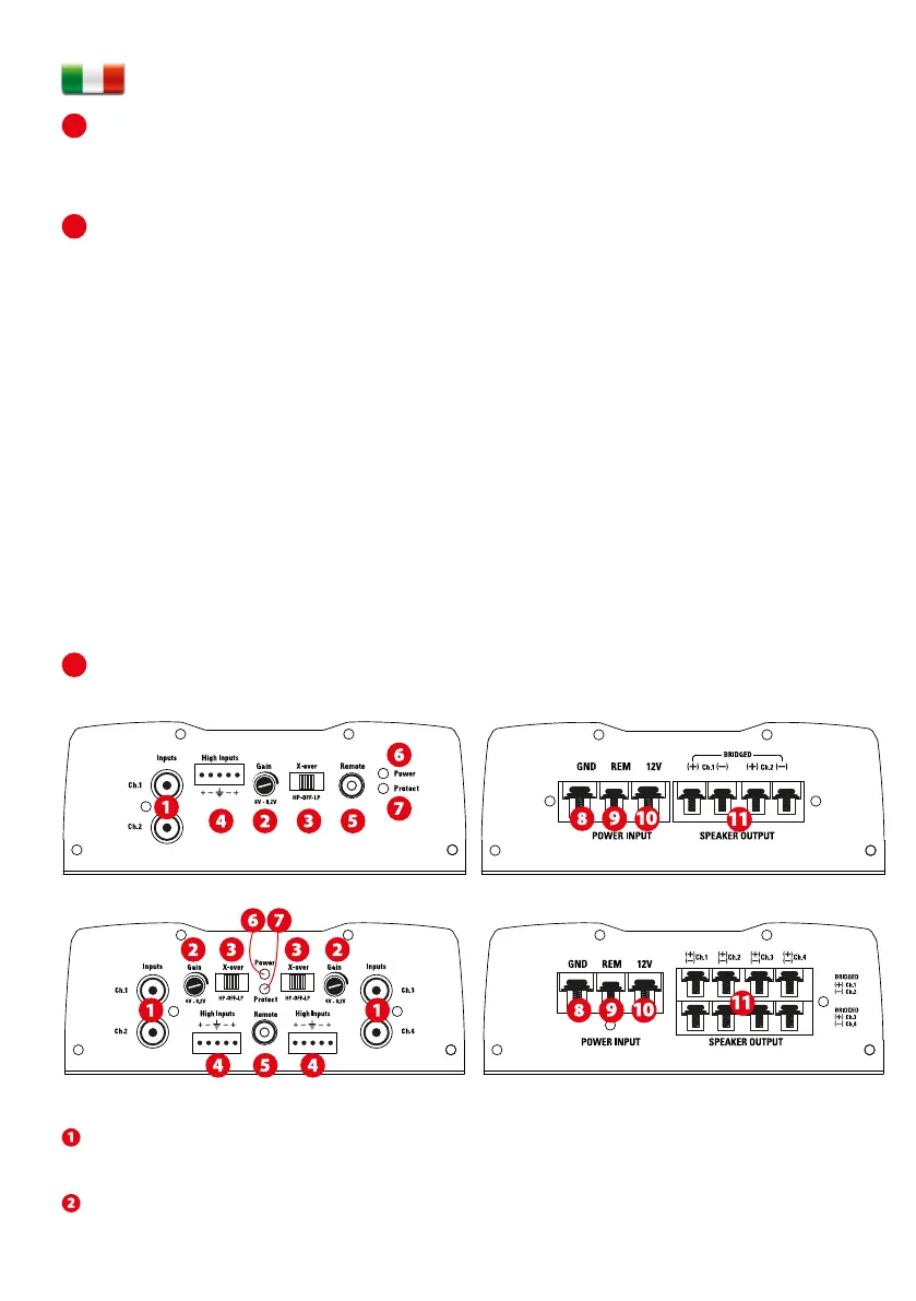 Controllo Gain (Gain) : Si utilizza per armonizzare la sensibiltà di uscita dell’autoradio con la sensibilità di ingresso dell’amplificatore. Regolabile