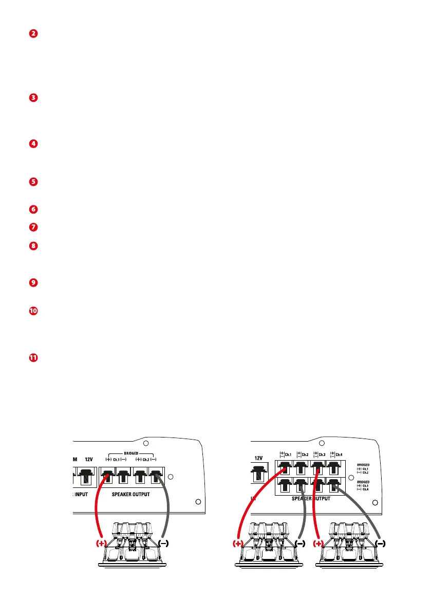TR450 : When bridging the amplifier, for the two first channels, use the Ch.1 positive terminal and the Ch.2 negative terminal only. For the two