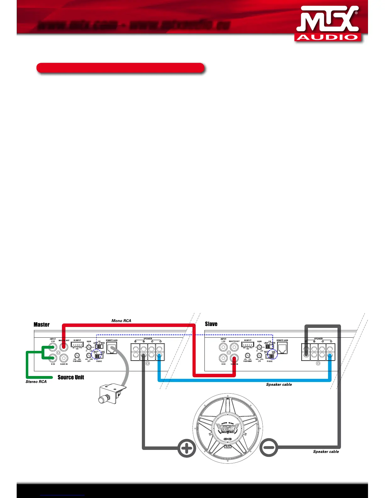 **Nota; El amplicador “Slave/Esclavo” no está conectado a las entradas de RCA. Este amplicador recibe su