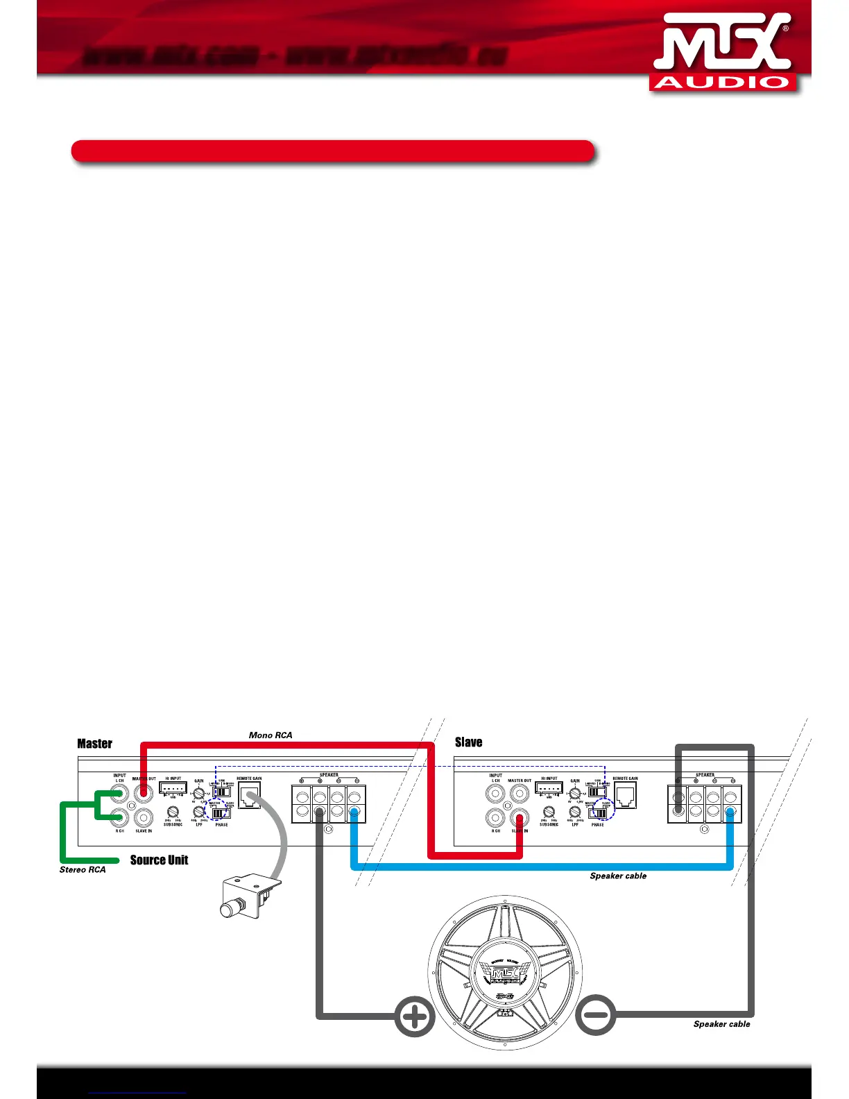 6. De positieve luidspreker uitgangen van de ”Master” versterker zijn de positieve aansluitingen voor de
