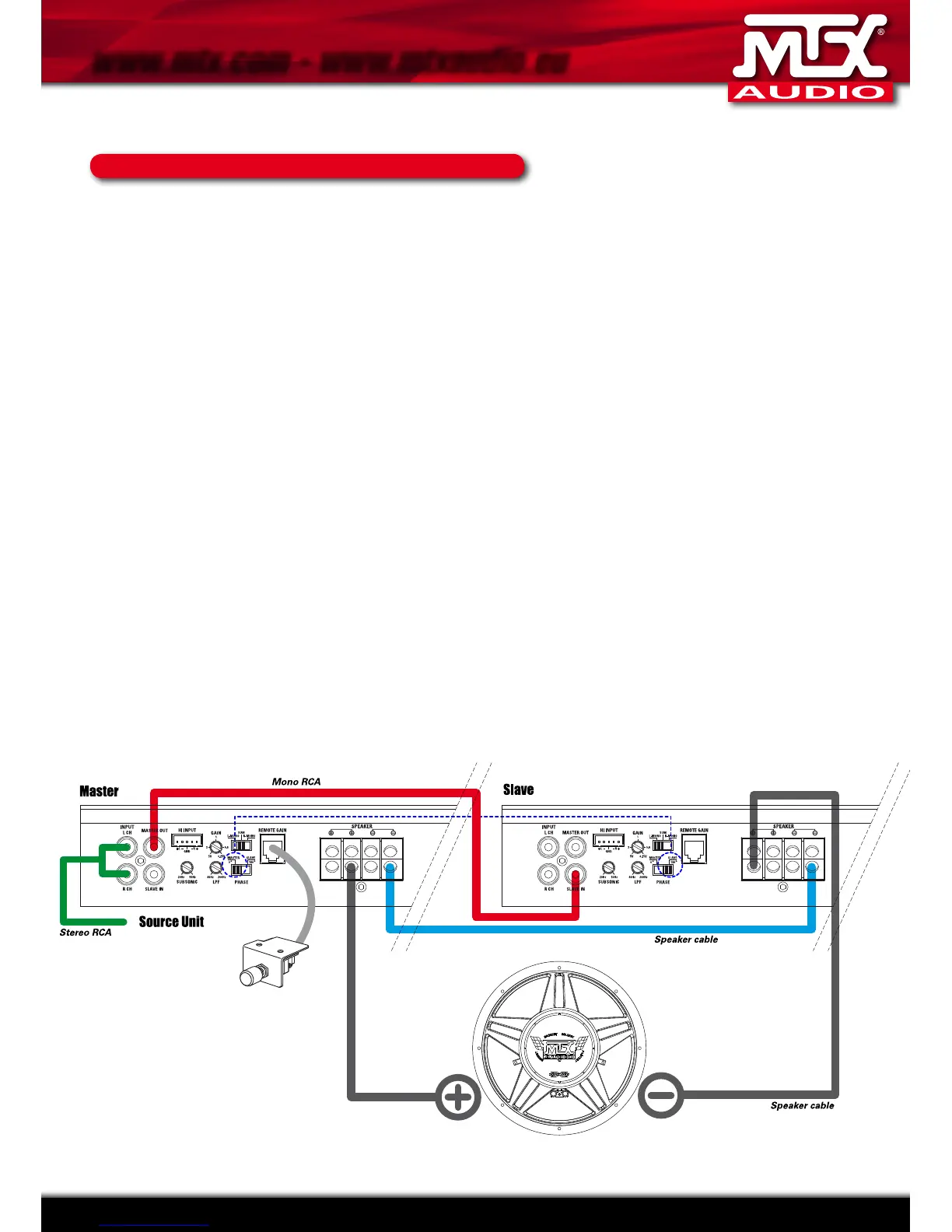 **Note: The ”Slave” amp is NOT connected at the RCA inputs. The ”Slave” amp receives its input signal only