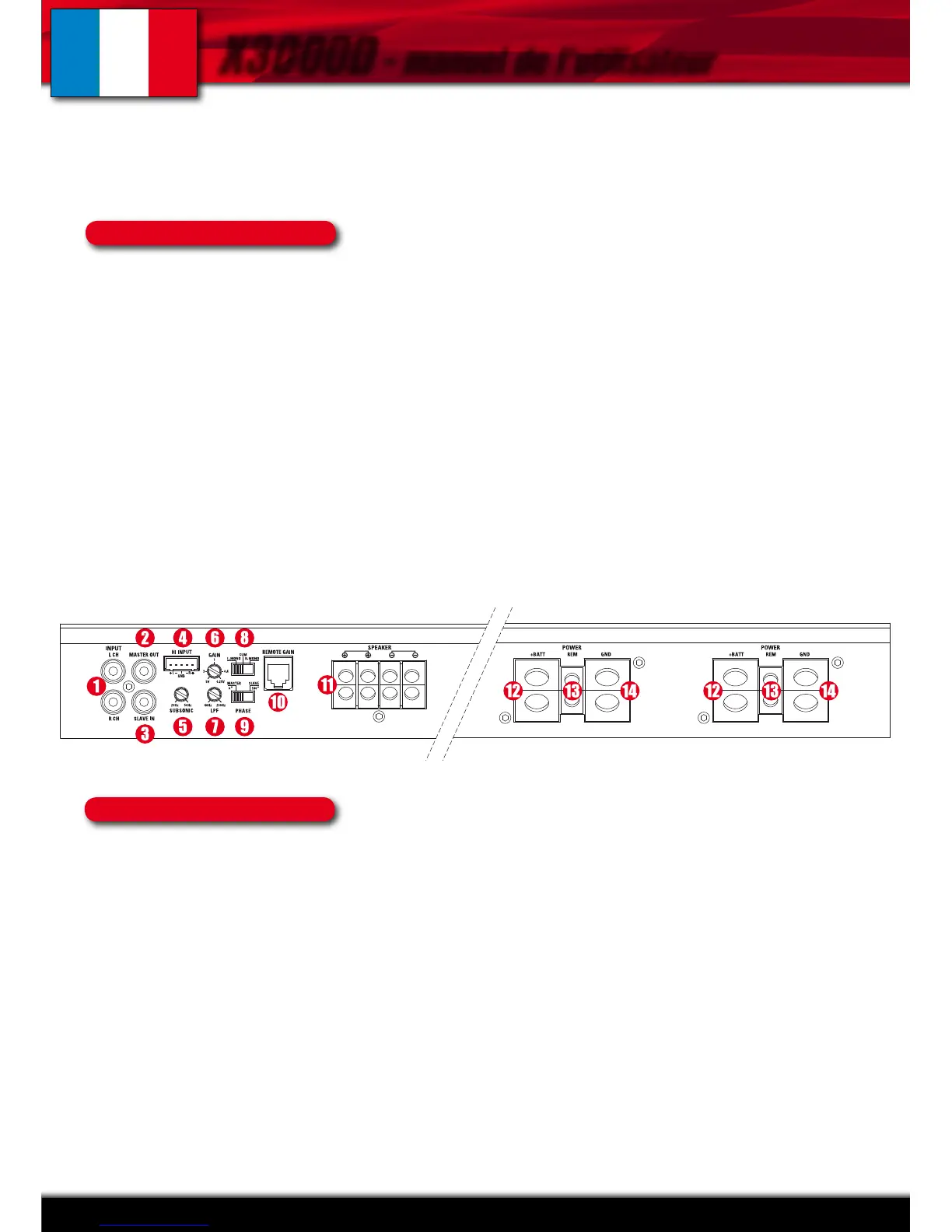 2. Connecteur RCA ”Master out” - Cette sortie est utilisée dans le cas d'une utilisation ”Strappée” de deux ampli-