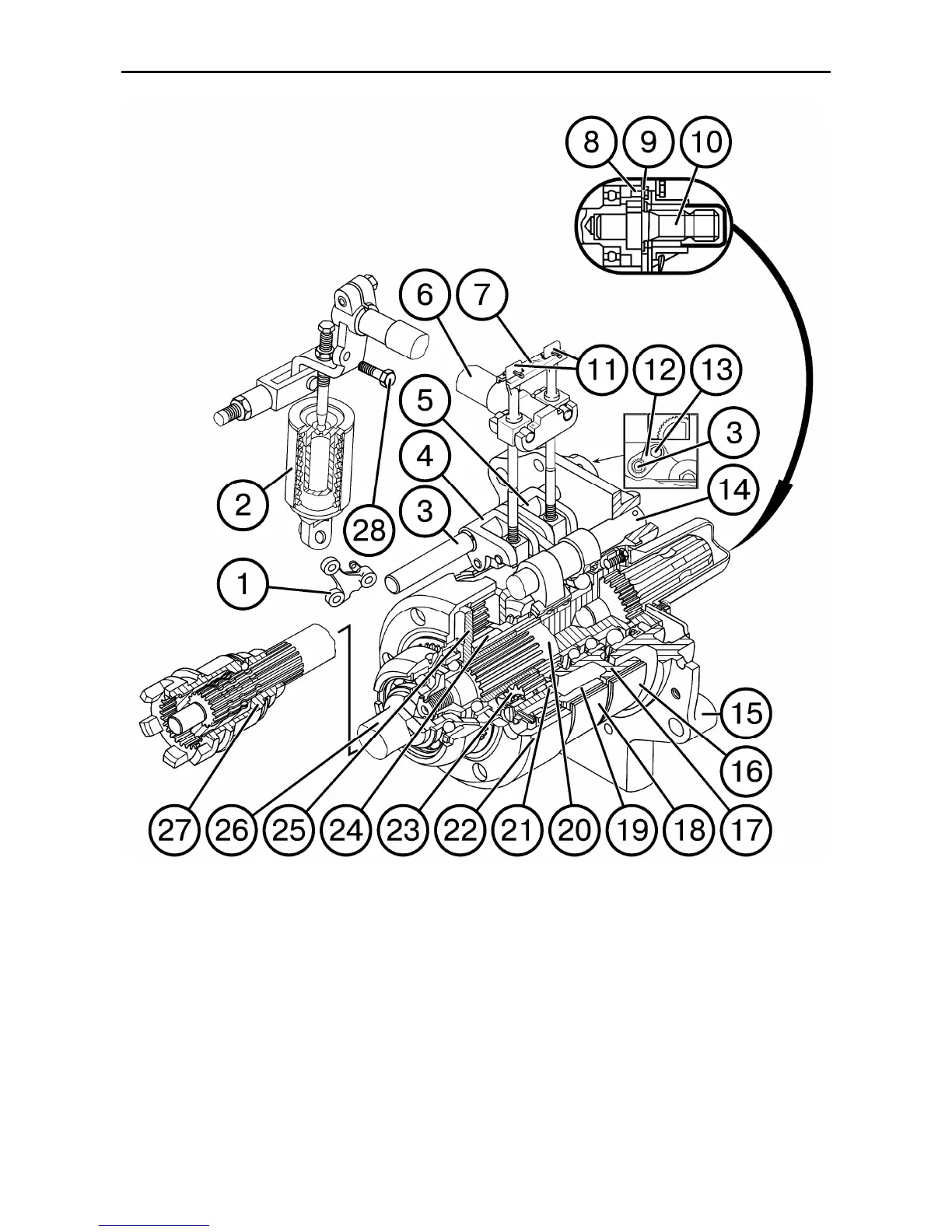 gear shaft; 27 – drive independent/synchronous shift clutch