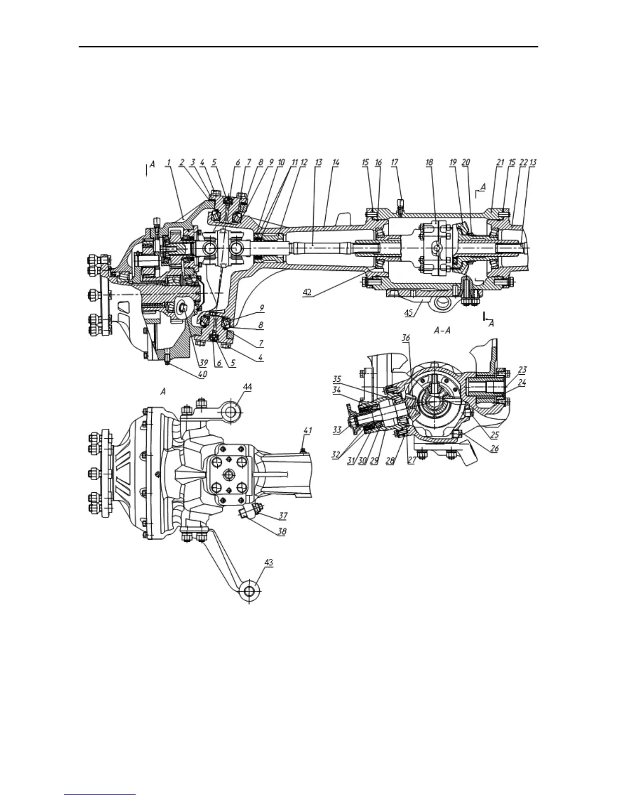 13 – half-axle shaft; 14 – left-hand housing; 17 – breather; 18 – differential; 19 – driven bevel gear; 20 – nut;