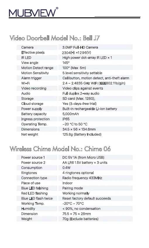 MUBVIEW Bell-J7 - 11. Product Specifications