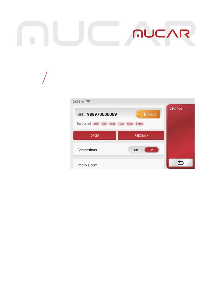 MUCAR CS - Settings; Order; Feedback; Screenshots