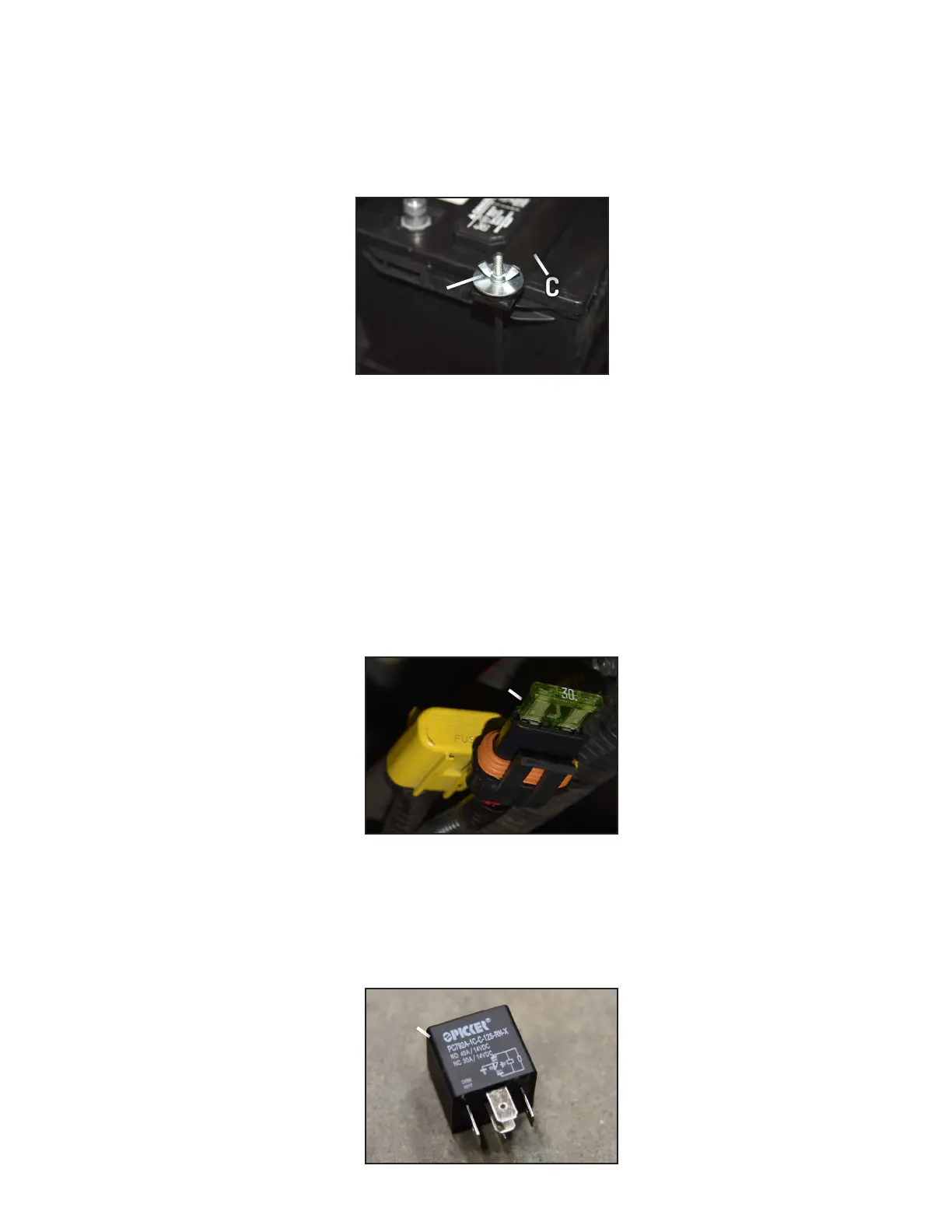 5. Remove the (2) nuts “B” and battery tie down “C” in Figure-5.