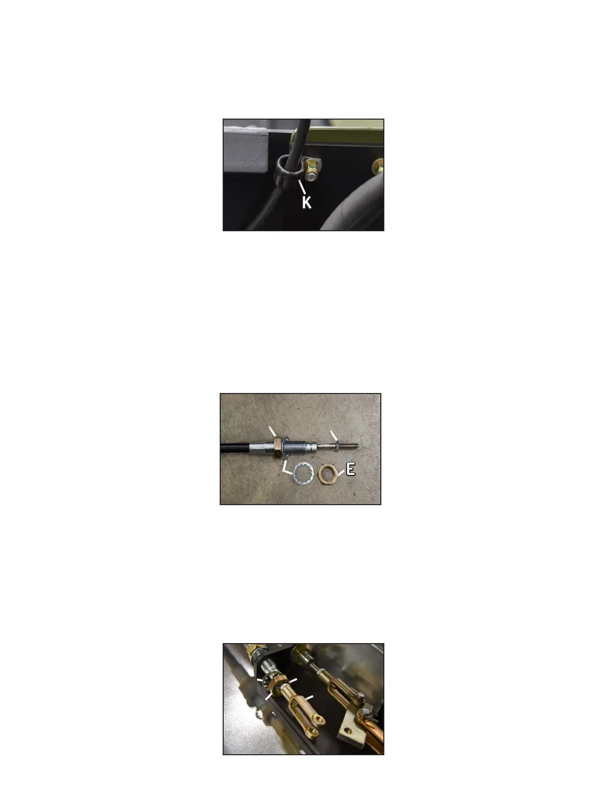 4. Once inside, loosely slide washers “L” and jam nuts “E” over the cable ends, (1) per each cable. Do not tighten