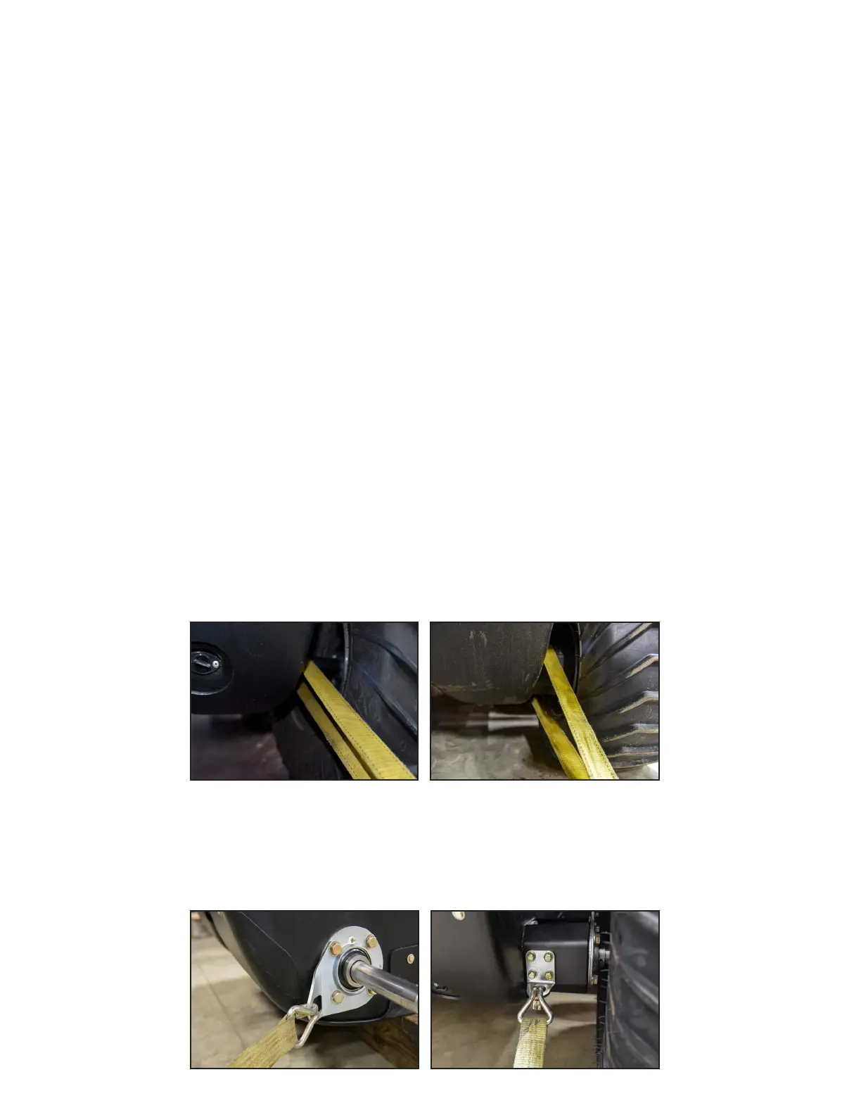 A total of (4) tie down straps are needed to adequately transport the Mudd-Ox. You will install one strap per each