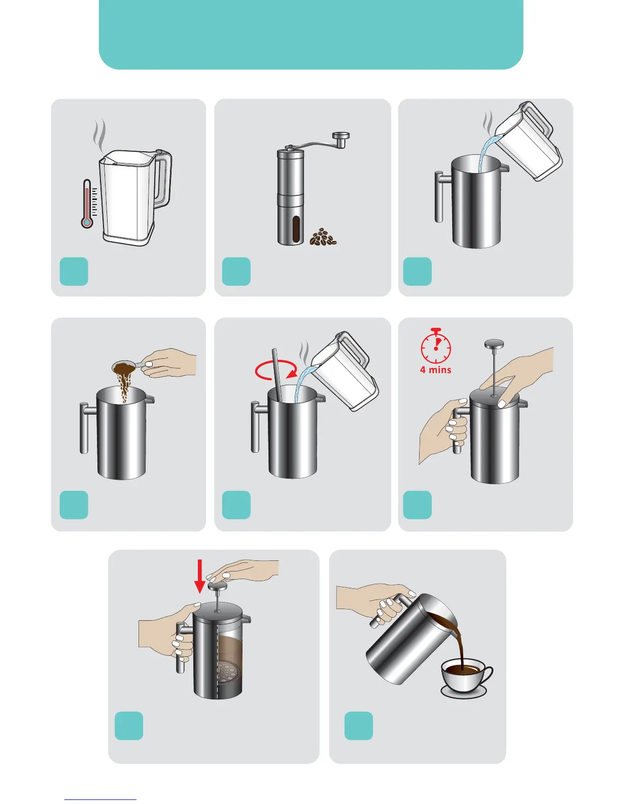 press down. Let the coffee brew for at least 4 minutes. We recommend