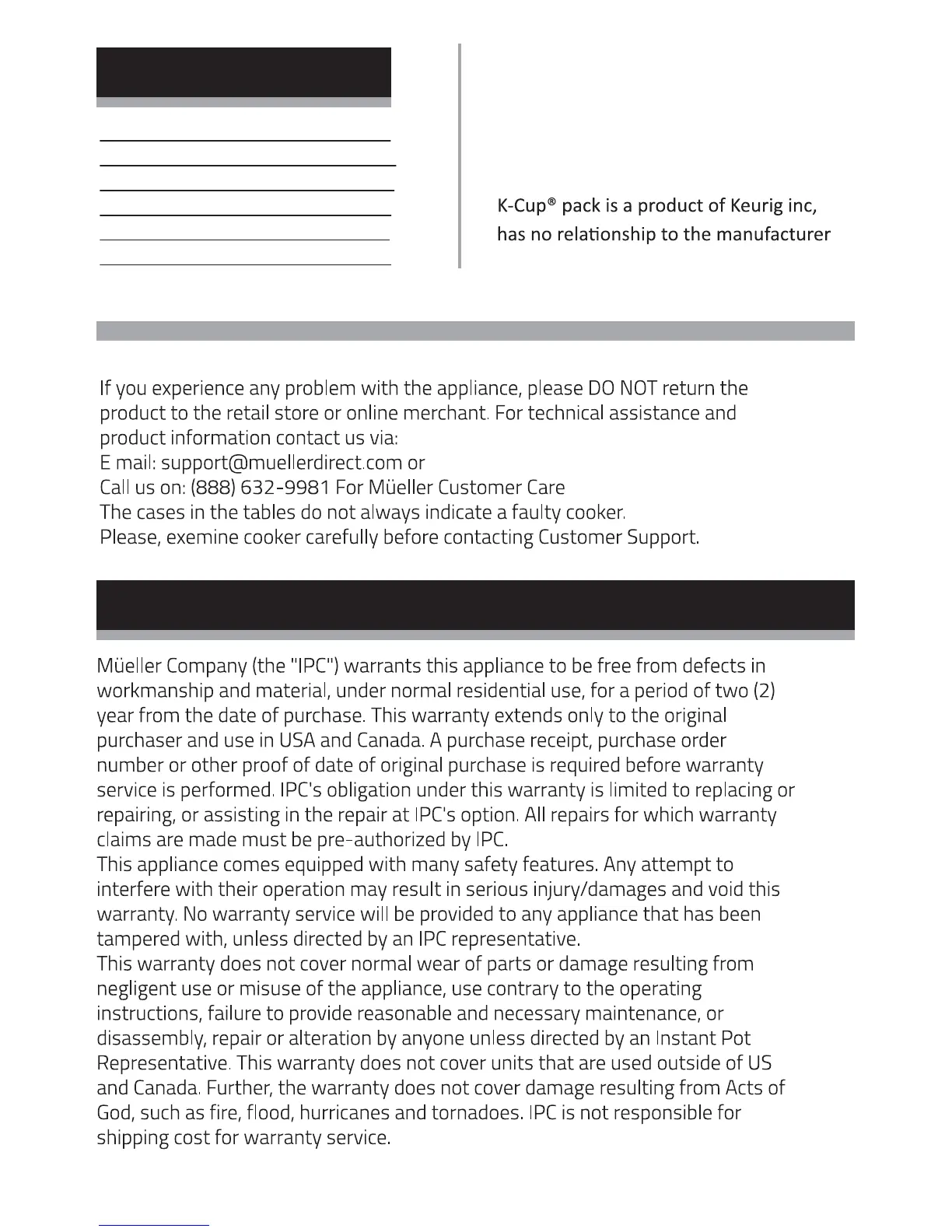 Mueller U-700 - Technical Data; Limited Warranty