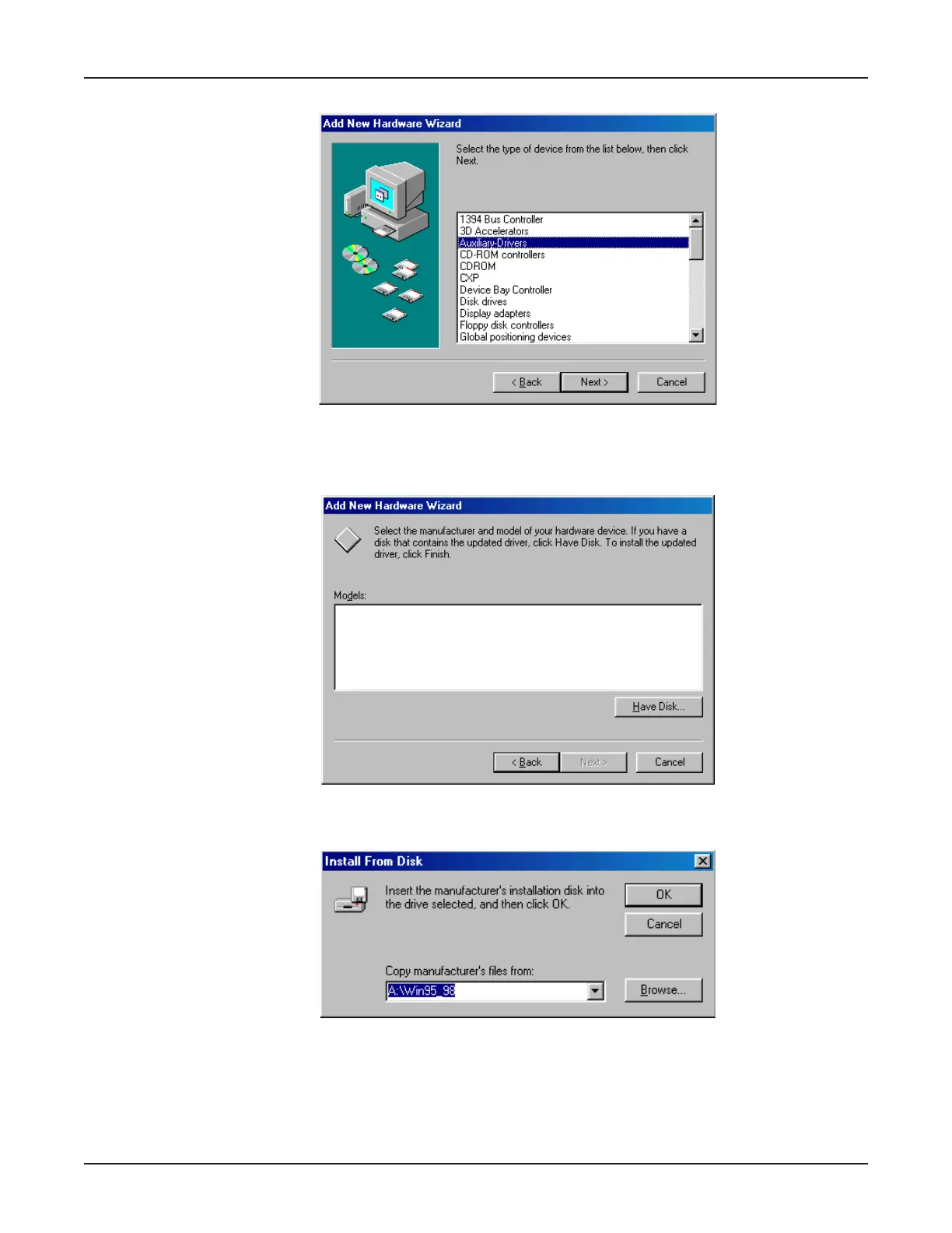 7. The Add New Hardware Wizard displays, asking you to select the manufacturer and model of