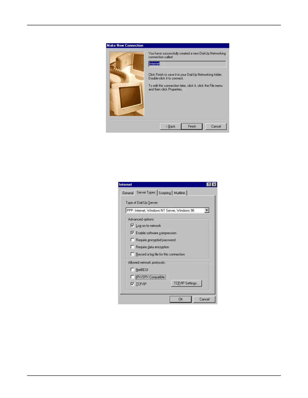 property sheet. Select the appropriate Server Type, Log on options, and protocol selections for the