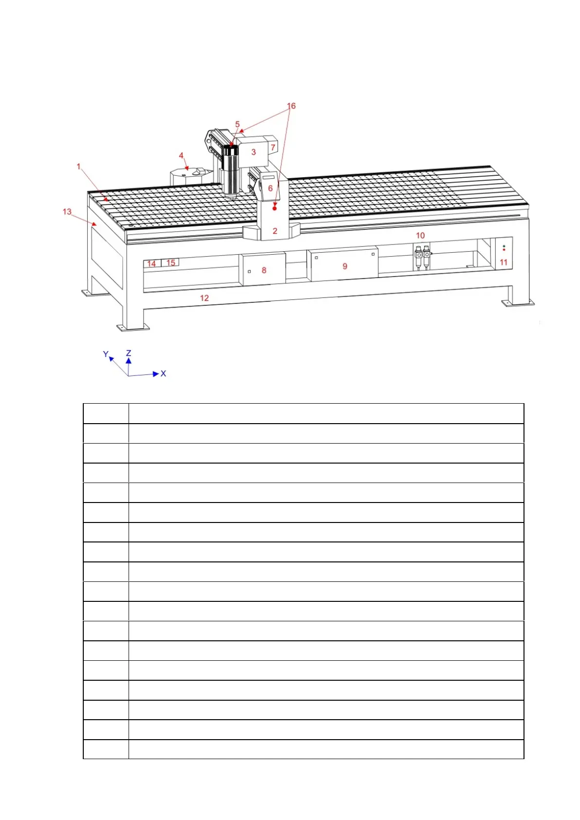 The following diagram and table indicates the location of major components of the machine. There