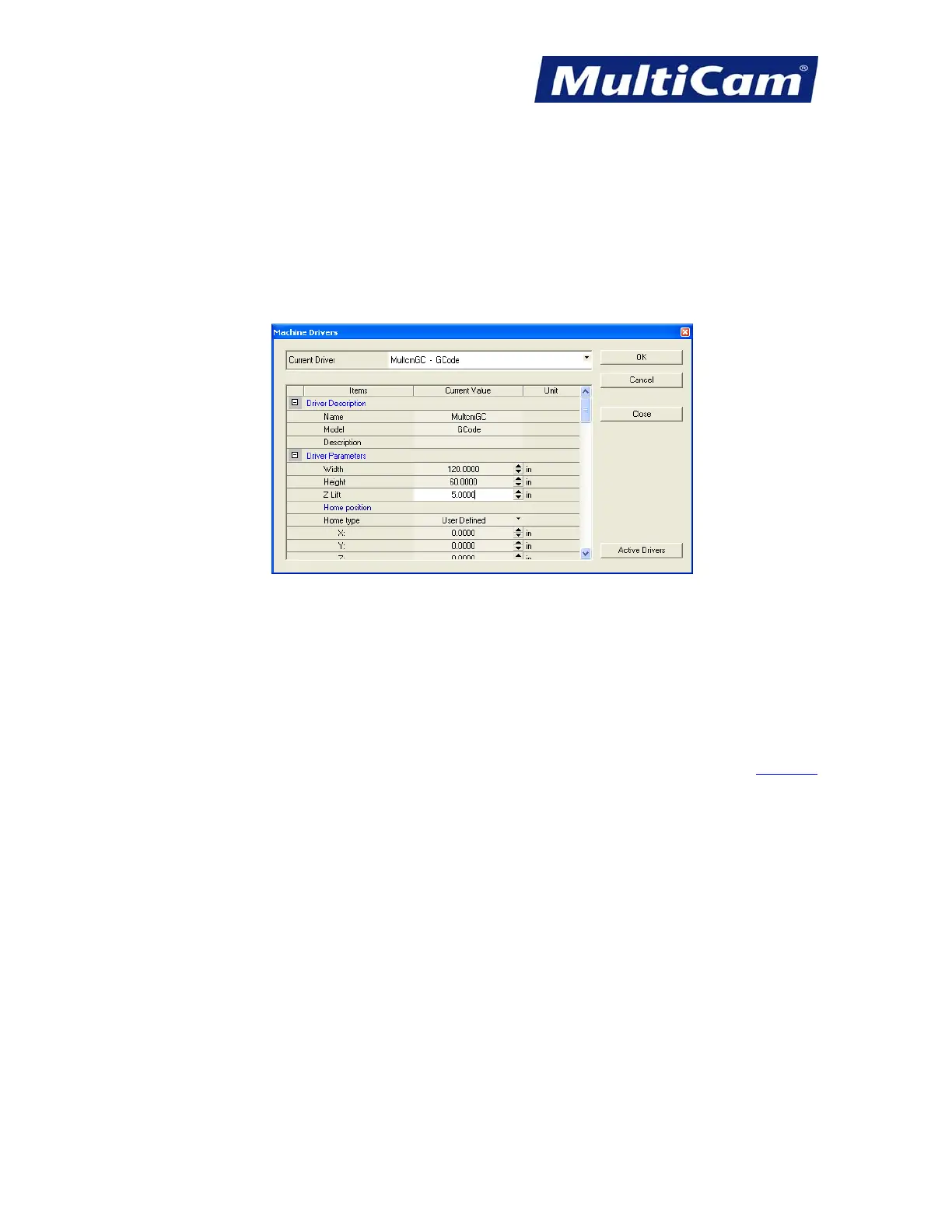 2. Scroll down to Driver Parameters and change the width, height, and Z lift to match the table.