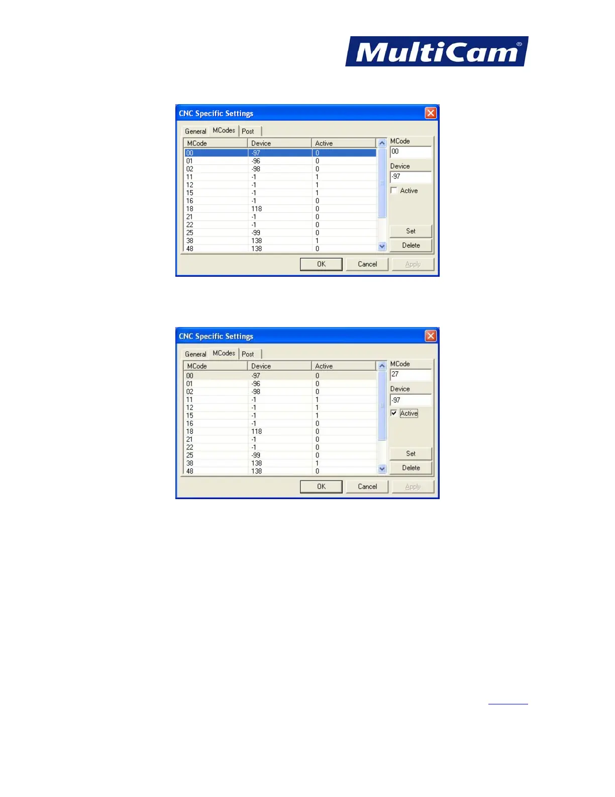 Modify - Highlight an existing M Code, make changes (e.g., Device -1 instead of -97), and select Set.