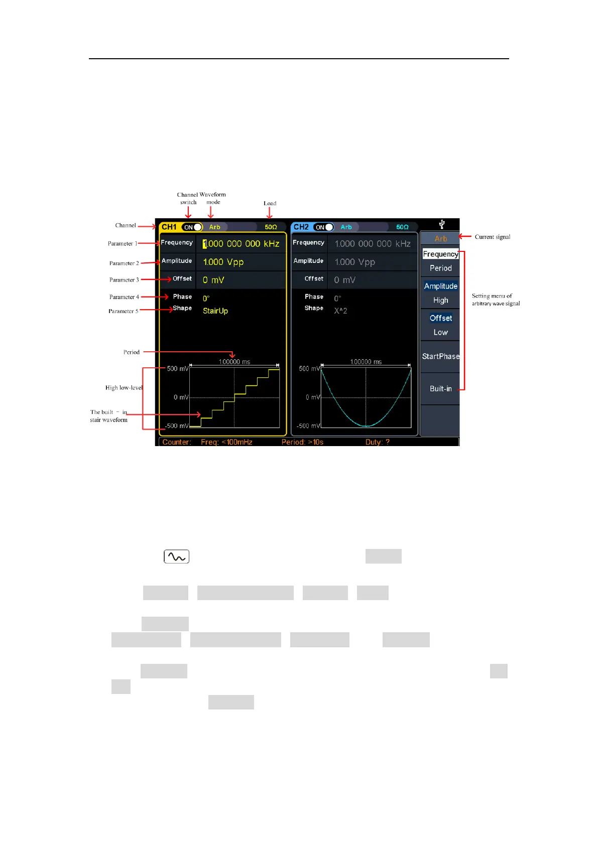 The arbitrary wave menu includes: Frequency/Period, Amplitude/High Level,
