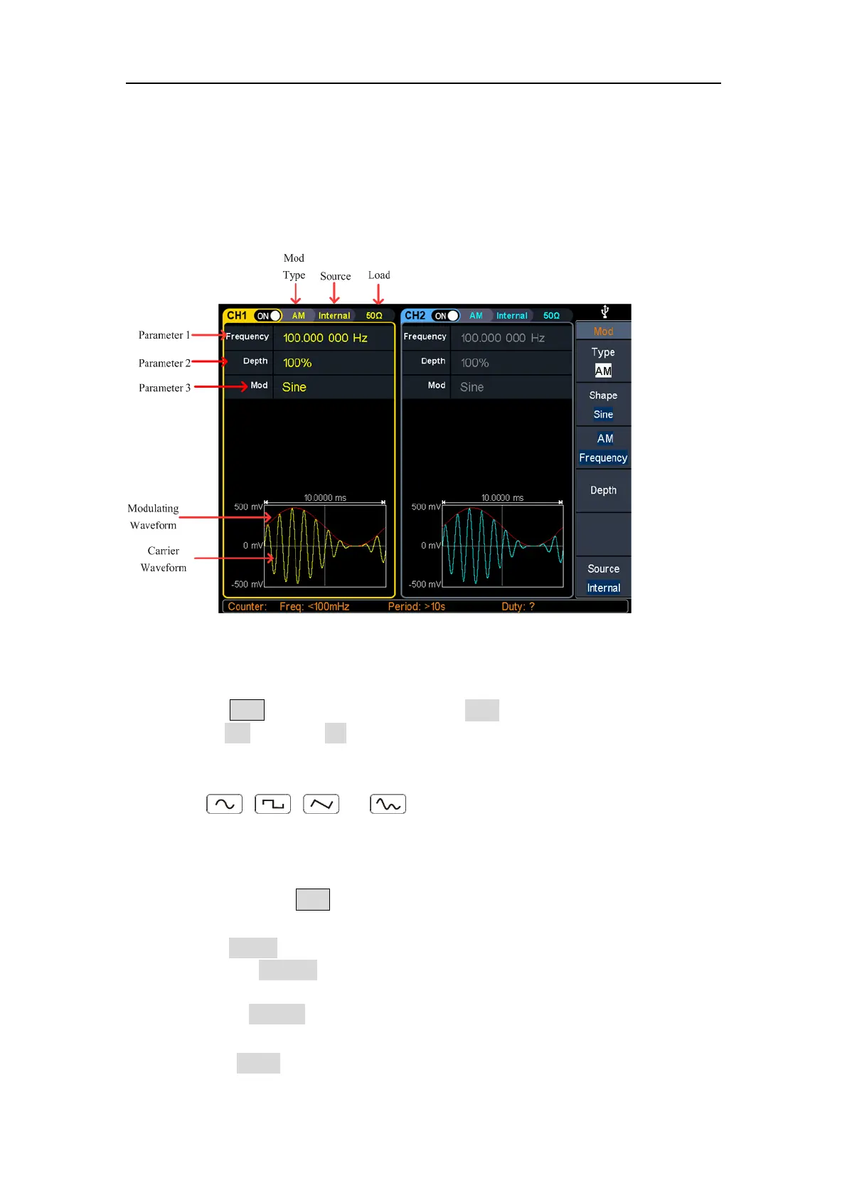 The carrier wave can be Sine, Square, Ramp, or Arbitrary wave (except DC).