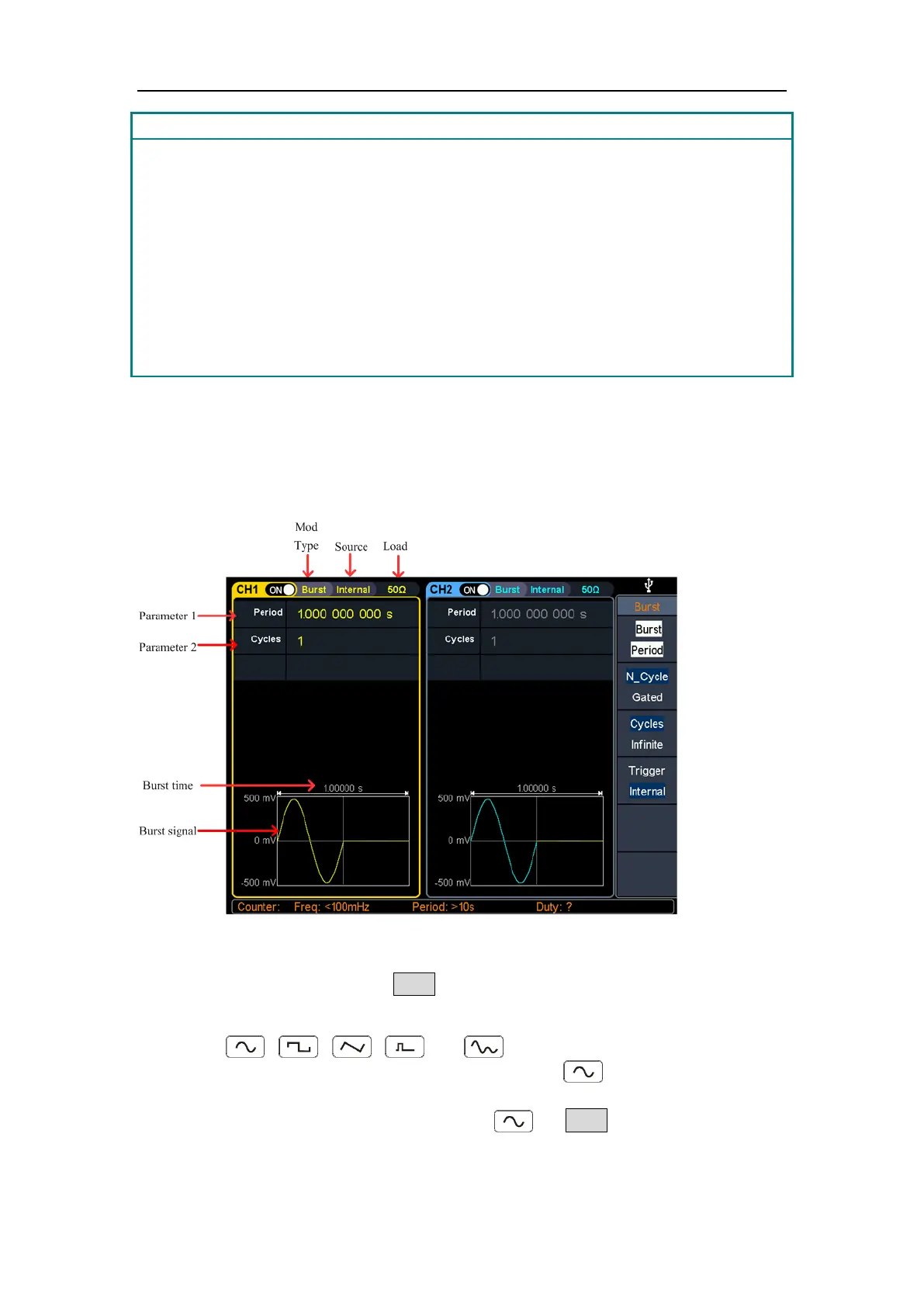 to Output Sine Wave on page 10. Press or Burst to return to the burst