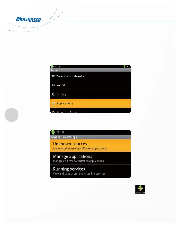 1) Haga clic en “Settings” [Configuraciones] y entre en “Applications” [Aplicativos]. Según mostrado abajo: