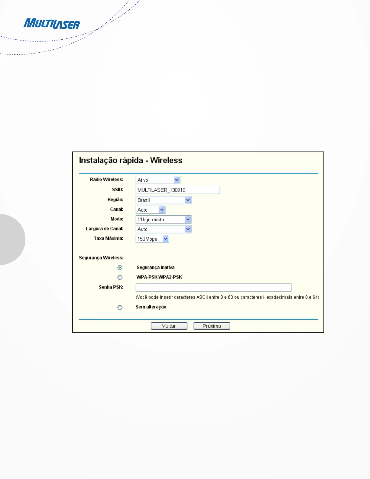 SSID is set to be MULTILASER_XXXXXX (XXXXXX indicates the last unique six numbers of each Router’s MAC