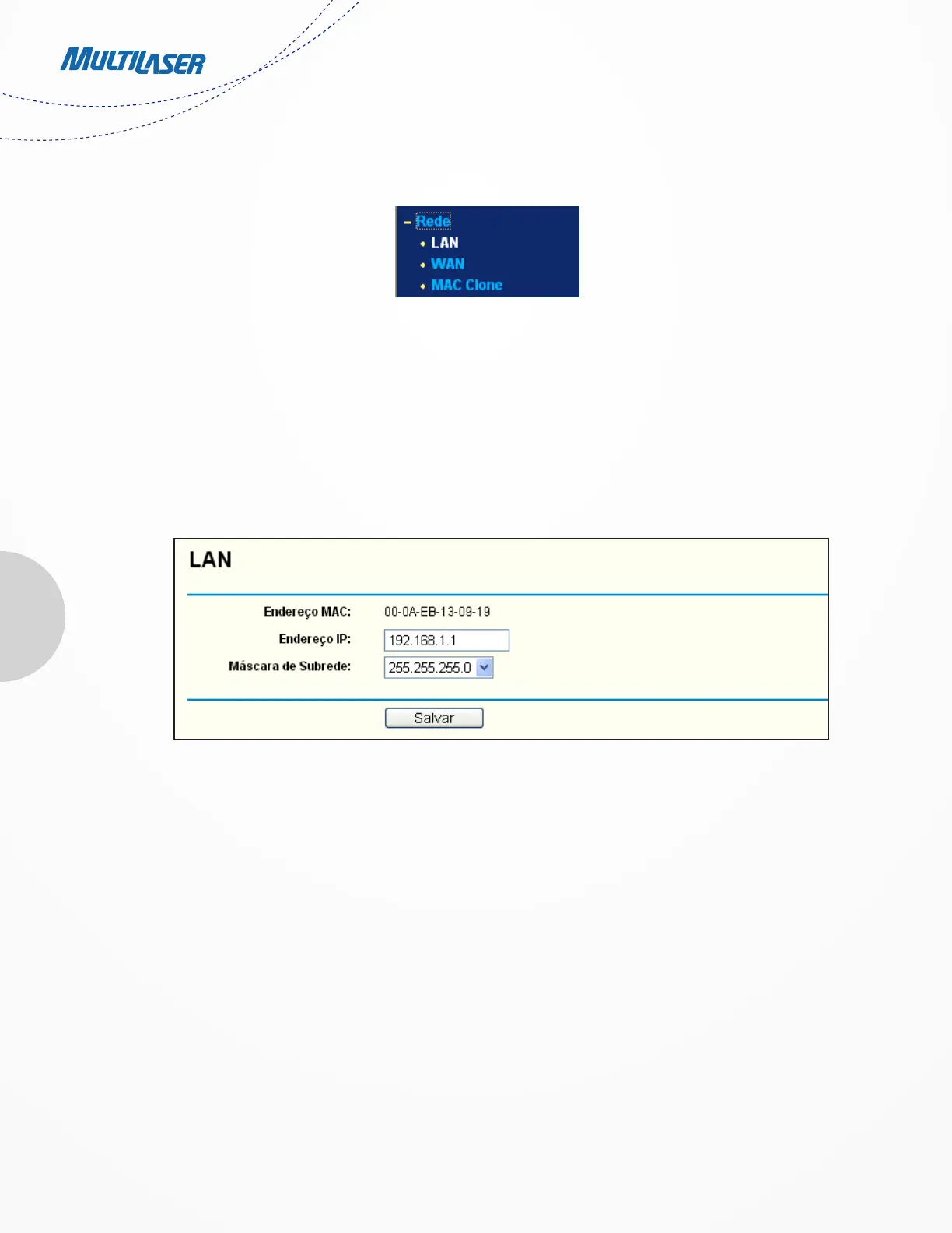 Existem três submenus abaixo do menu Rede (mostrado na Figura 4-5): LAN, WAN e MAC Clone. Clique em qualquer um deles, e você