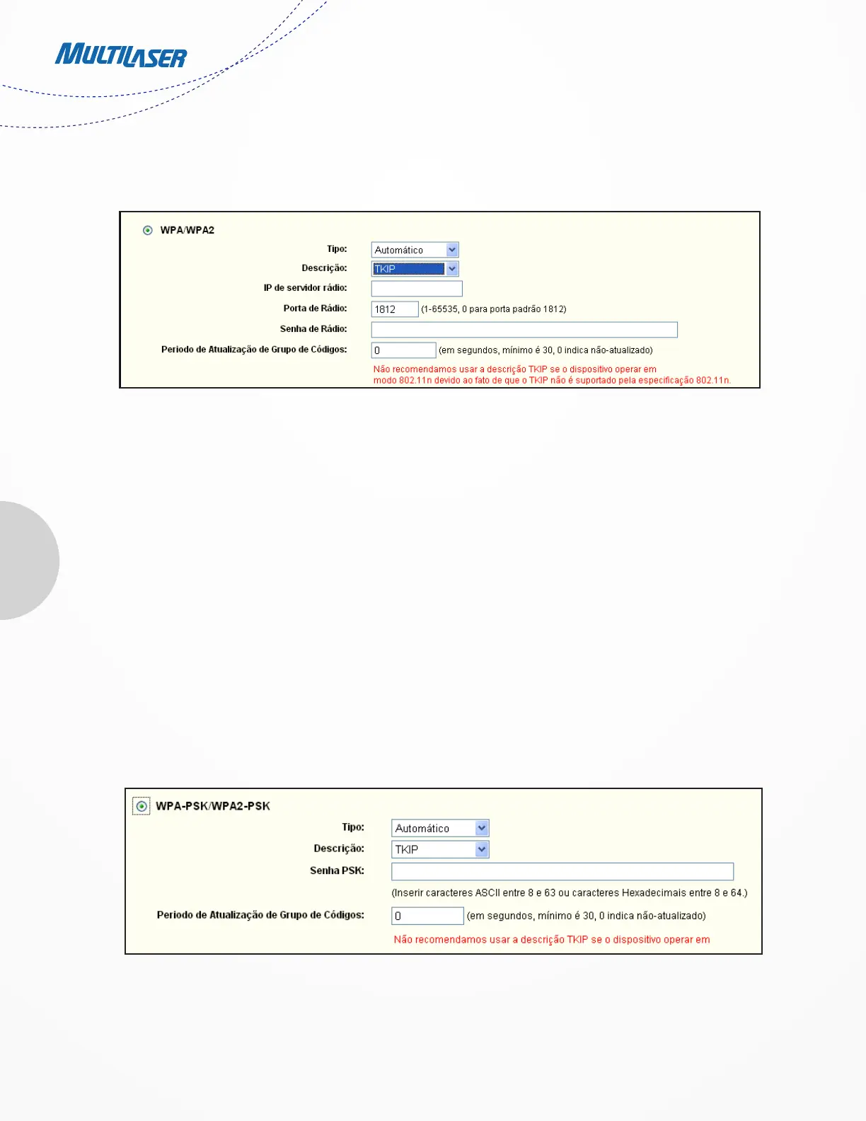 Se você marcar o botão de seleção WPA-PSK/WPA2-PSK e selecionar TKIP para a criptografia, encontrará um aviso em vermelho,