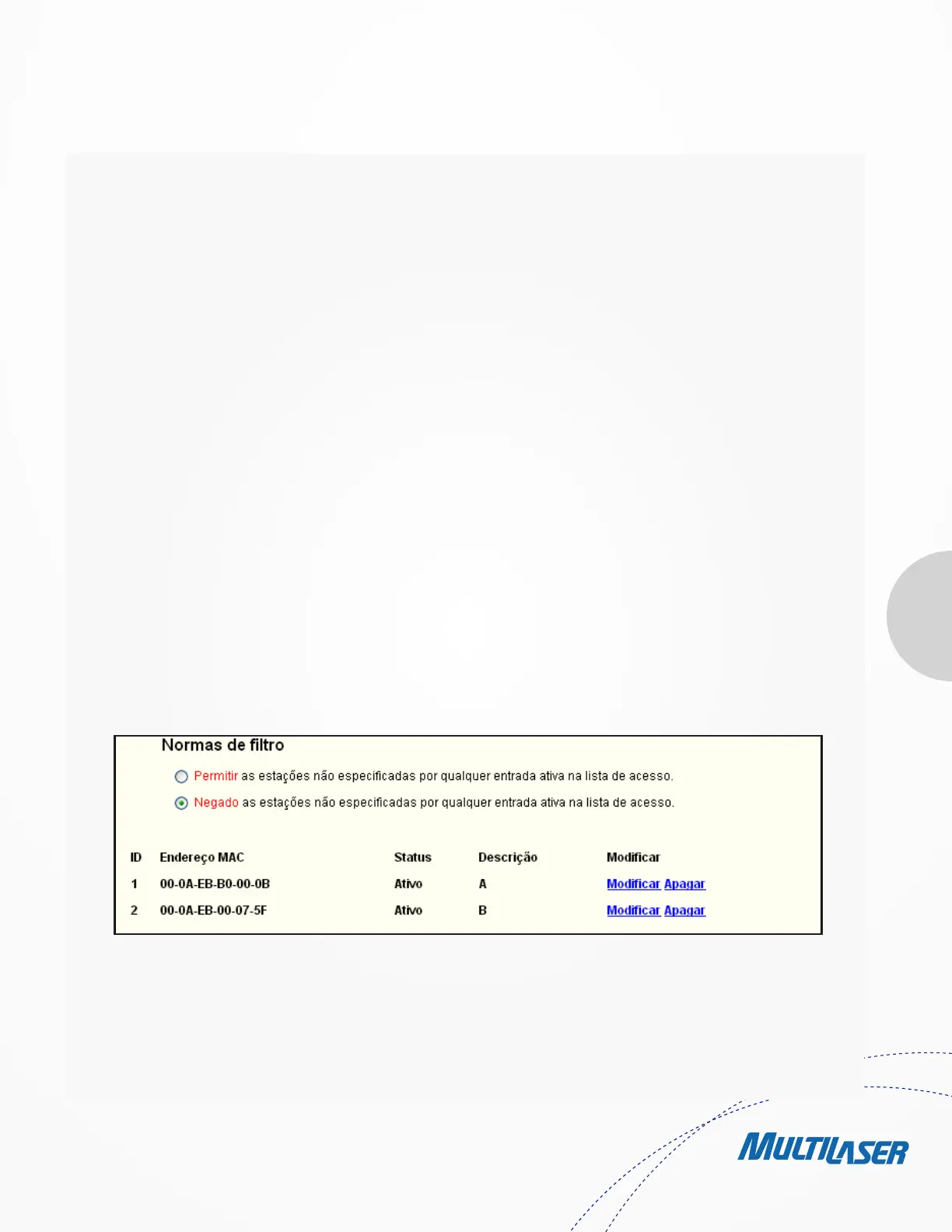 um endereço MAC 00-0A-EB-00-07-5F possam acessar o Roteador, mas todas as outras estação wireless não, você pode configurar a