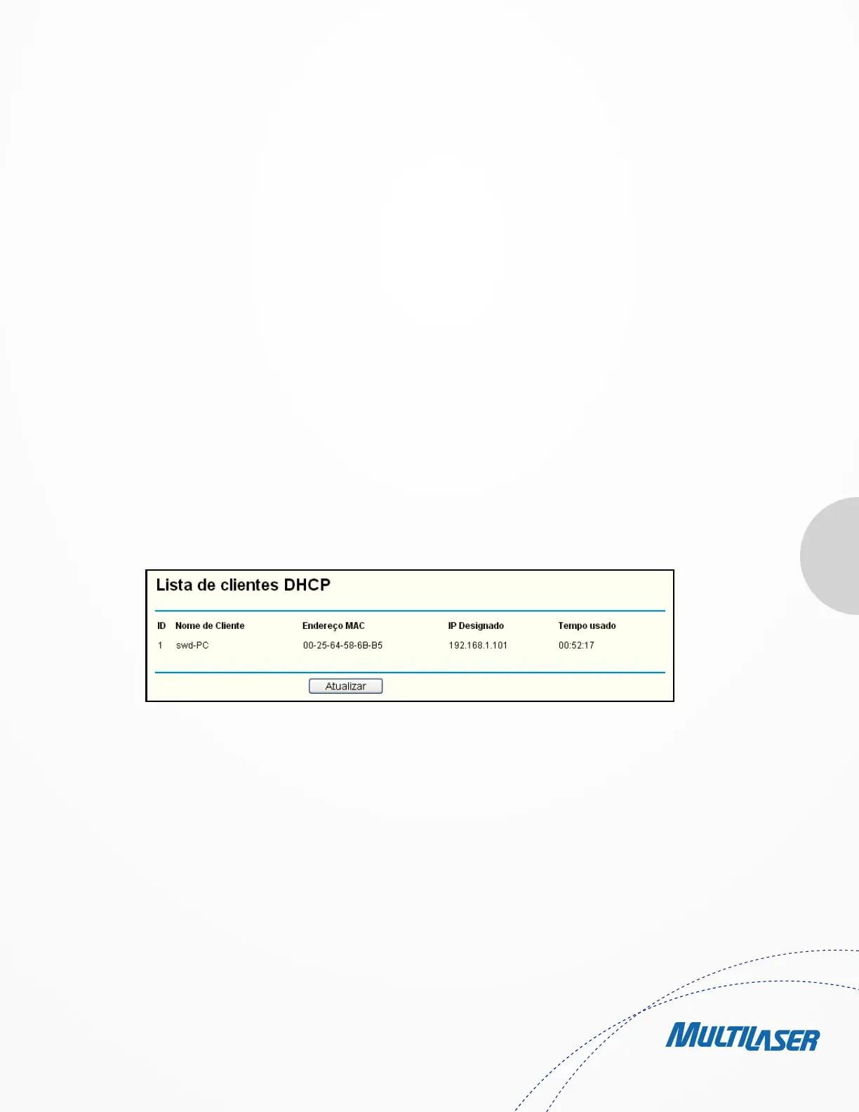 Selecione o menu “DHCP > Lista de Clientes DHCP” para visualizar as informações sobre os clientes conectados ao Roteador na tela,