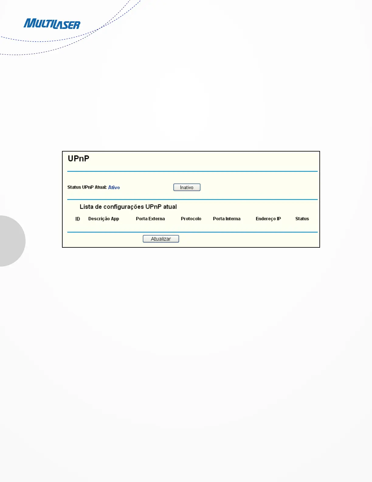 • Status Atual do UPnP – O UPnP pode ser habilitado ou desabilitado clicando o botão Ativo ou Inativo.
