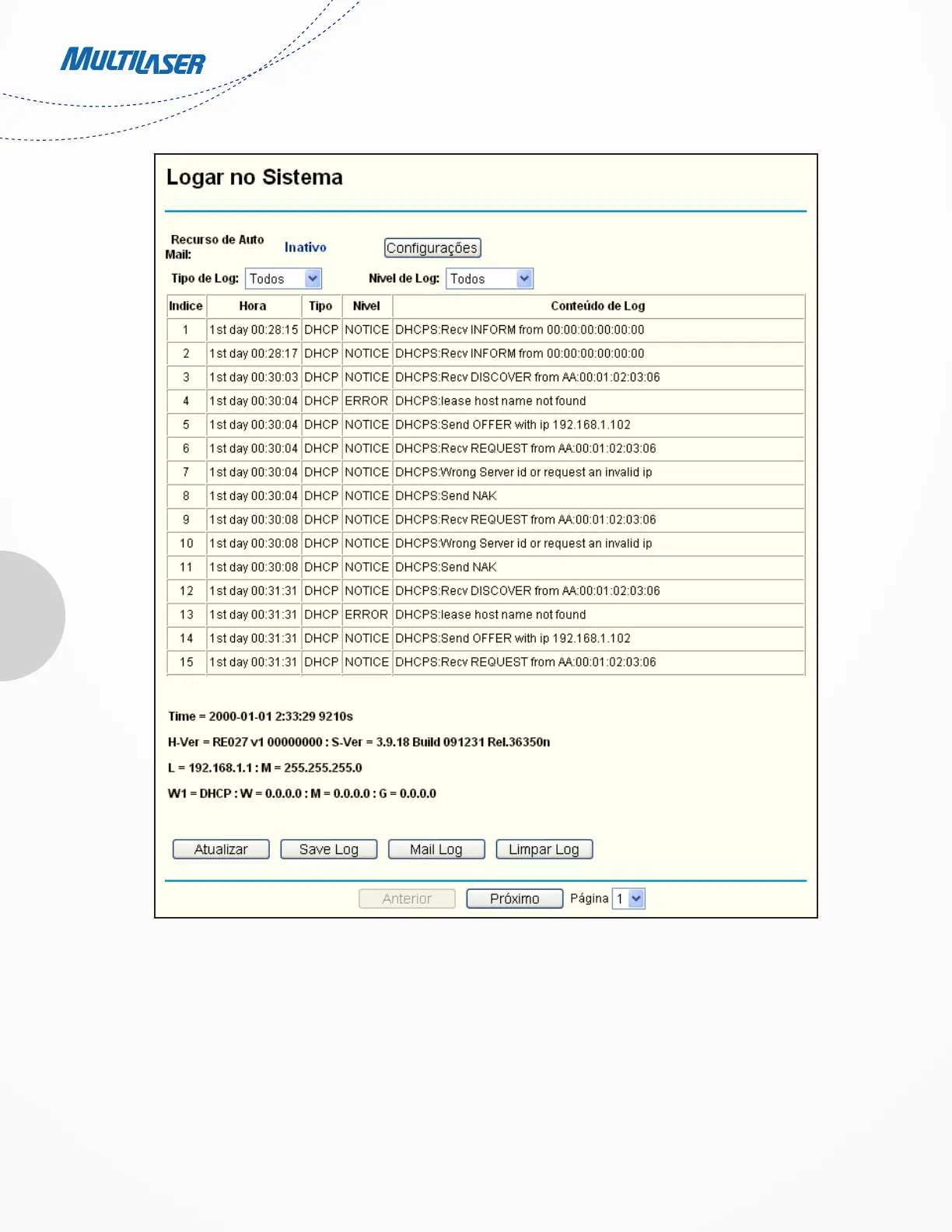 Configurações do E-mail – Define o endereço de e-mail de recebimento e envio, endereço do servidor, informões