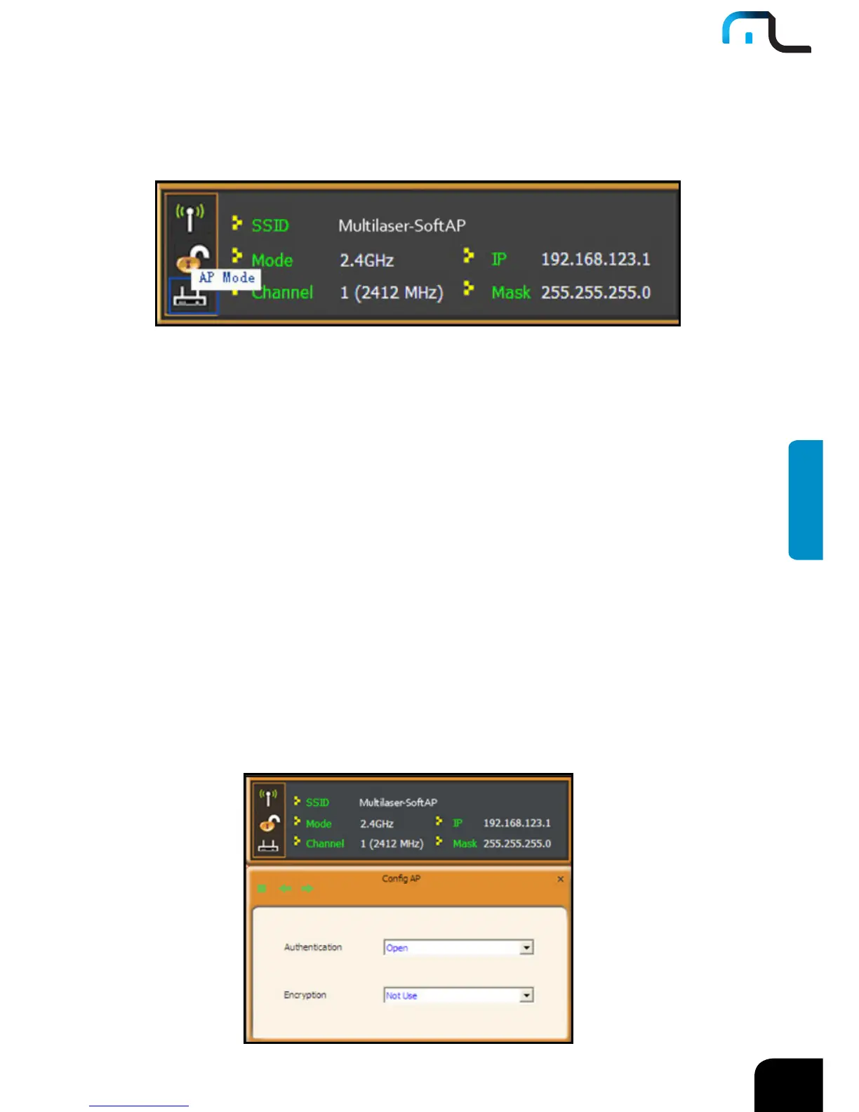 Encender RF, Seguridad/Sin seguridad e icono de modo AP.