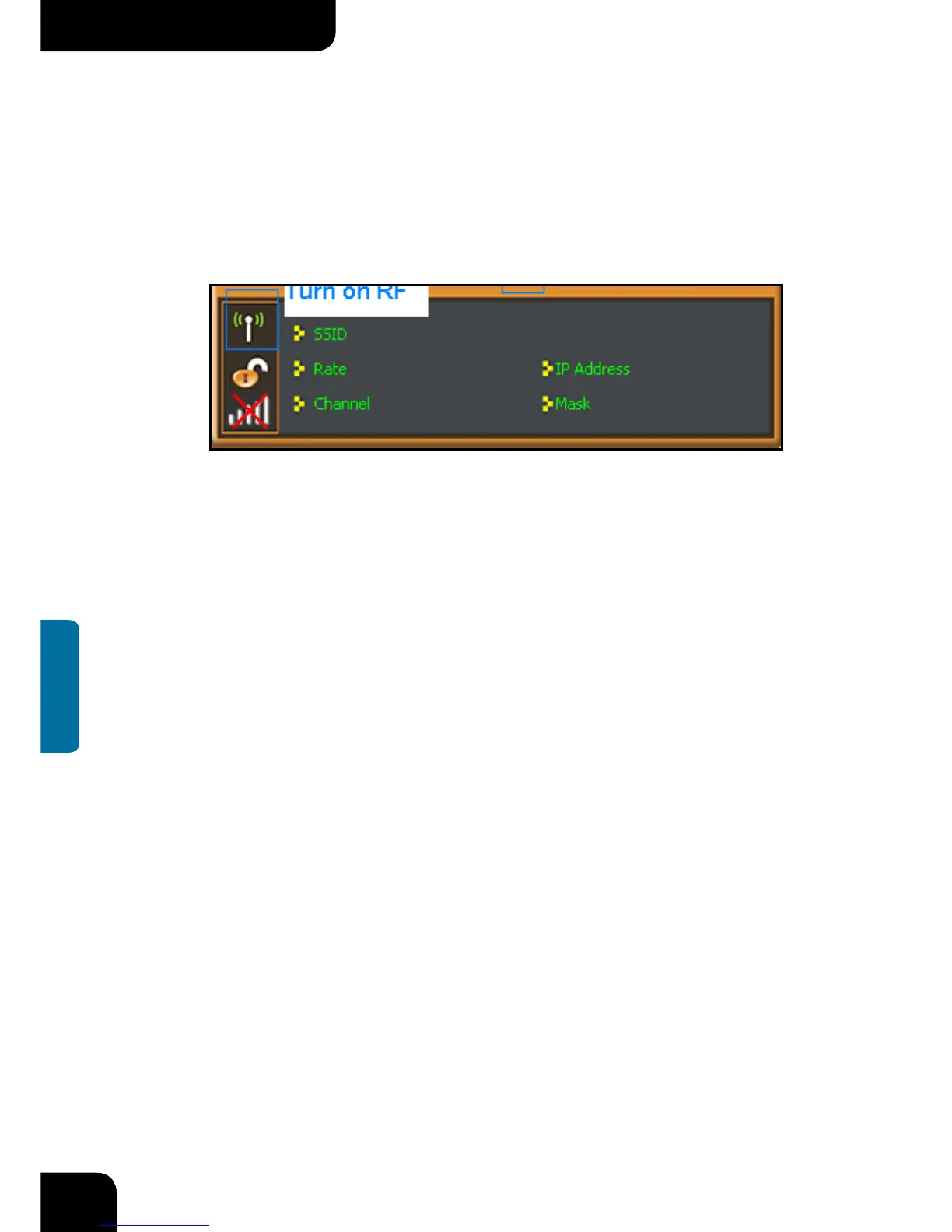 Turn On/Off RF, Security /No security, and Signal status.