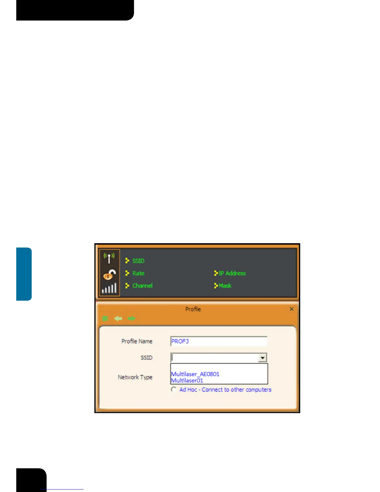Infrastructure”,and enter the profile name and SSID or you can find the SSID you wish to