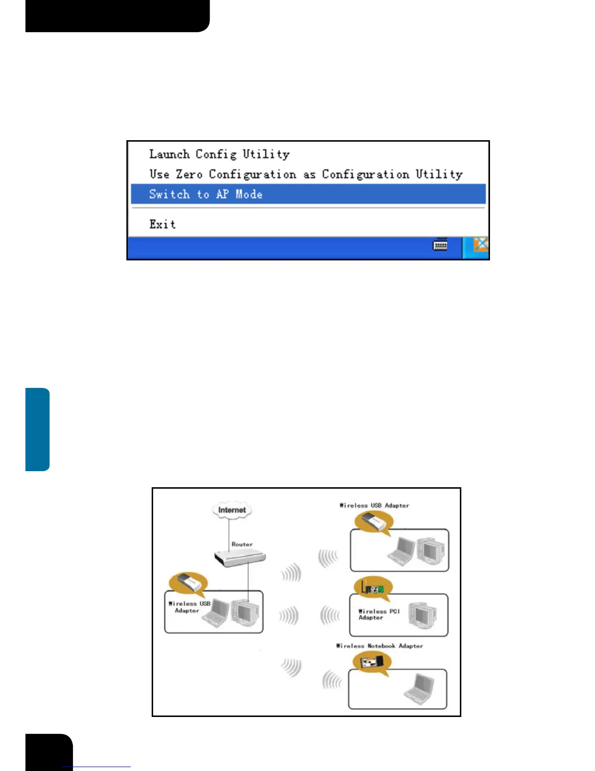 In this mode, the wireless adapter acts as an AP to transmit wireless signal and create a