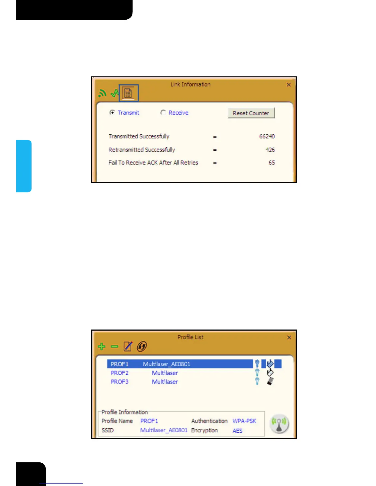 3. A tela "Statistics" é usada para contar os pacotes de dados Rx e Tx totais, incluindo