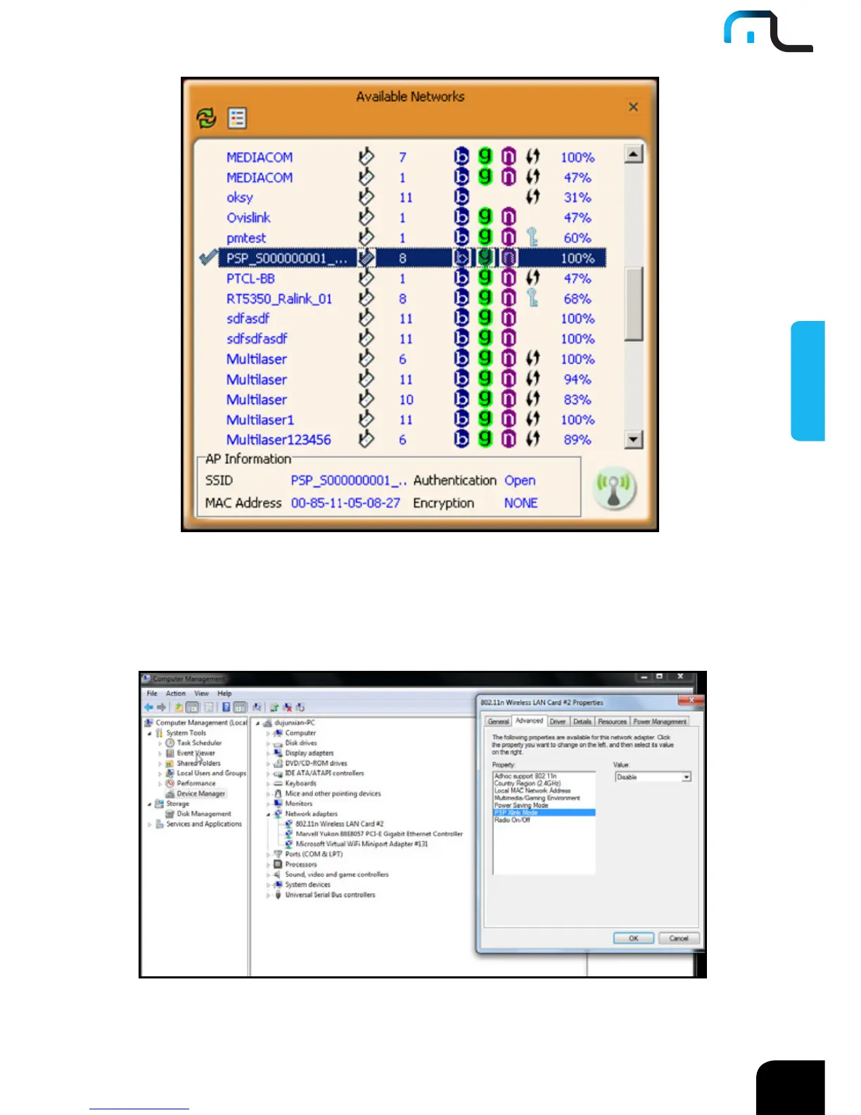 adaptador wireless, clique em "Properties" e então habilite a função PSP Xlink.